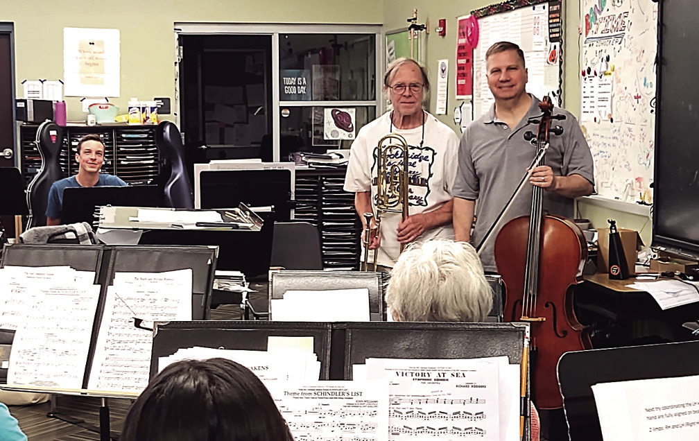 THESE TWO MEMBERS of the Rockbridge Symphony, shown at practice for the upcoming “Tributes” concert, are veterans of the U.S. military. Dave Krantz (left) served in the U.S. Air Force, Aero Medical Lab, from 1969 to 1973. Tom Timmes served in the U.S. Army, Medical Services Corps, from 1992 to 2017. (Jack Bissett photo)