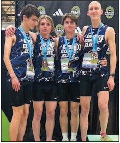 EAST COAST Elite Club team members wear their medals after placing fifth in the boys’ 4000-meter distance medley relay at the Adidas Indoor Track Nationals in Virginia Beach. They are (from left) sophomores Sammy Eastwood, Tyler Ludtke and Oscar McClung and junior Isaiah Howdyshell. (Drew Ludtke photo)