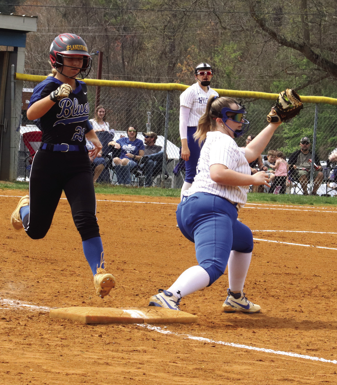 FIGHTING BLUE freshman first baseman Patience Hill puts her footon the bag to get RC senior Cameron Terry out while PM senior second baseman Natalie Mohler (far right) stands by. (Stephanie Mikles Blevins photo)