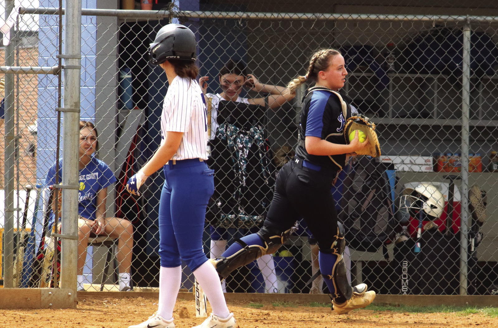 PM FRESHMAN catcher Sophie Chittum gets ready to throw the ball while RC junior Gabby Brown walks toward home plate to bat. Brown recorded two hits. (Stephanie Mikles Blevins photo)
