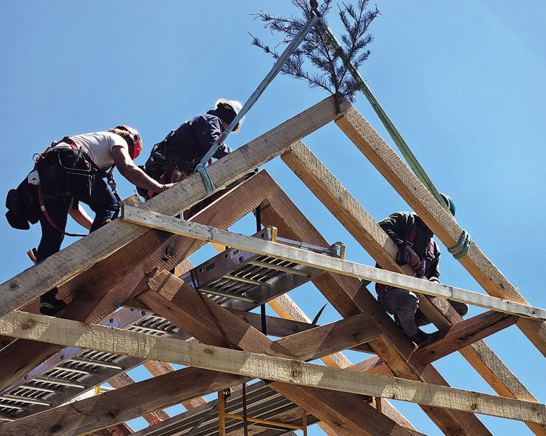 AN EVERGREEN BOUGH is placed at the peak of the completed timber frame in Glasgow. Often called a “whetting bush,” it honors a centuries-old tradition — symbolizing gratitude for the wood, the builders, and a safe raising. (photos courtesy of Dave Van Osten)