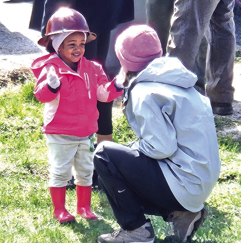 A TIMBER FRAMER puts her hard hat on Aylah Hartwill-Brown, the daughter of the president of the Concerned Citizens of Glasgow, Keshia Hartwill.