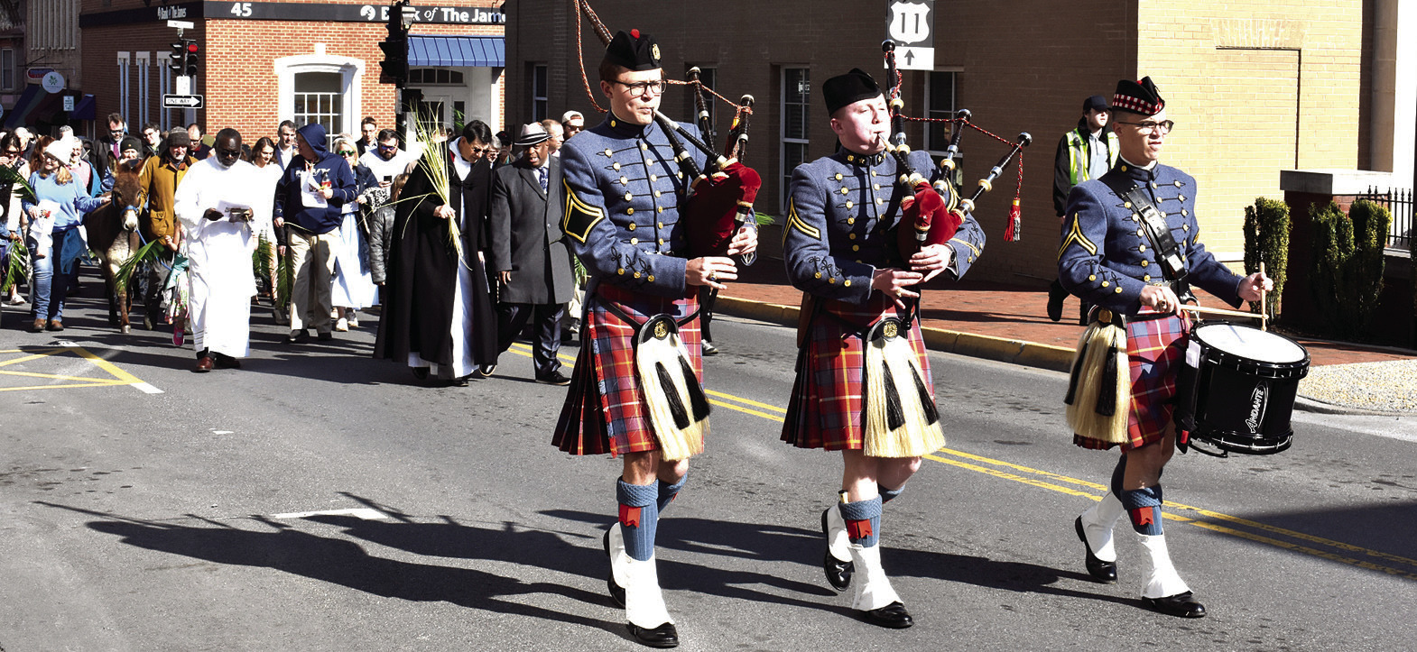ATRIO of musicians from Virginia Military Institute’s regimental band leads the processional east on Nelson Street. The bagpipers played both sacred and secular songs, including “Shenandoah” and “Joyful, Joyful We Adore Thee.” (Joann Ware photo)