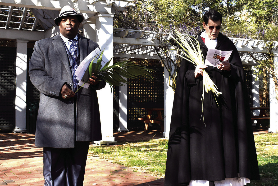 THE REV. DR. DAVID COX reads from the book of Matthew 21:1-11 in Hopkins Green this past Sunday. He is joined by First Baptist Church pastor McKinley Williams. (Joann Ware photo)