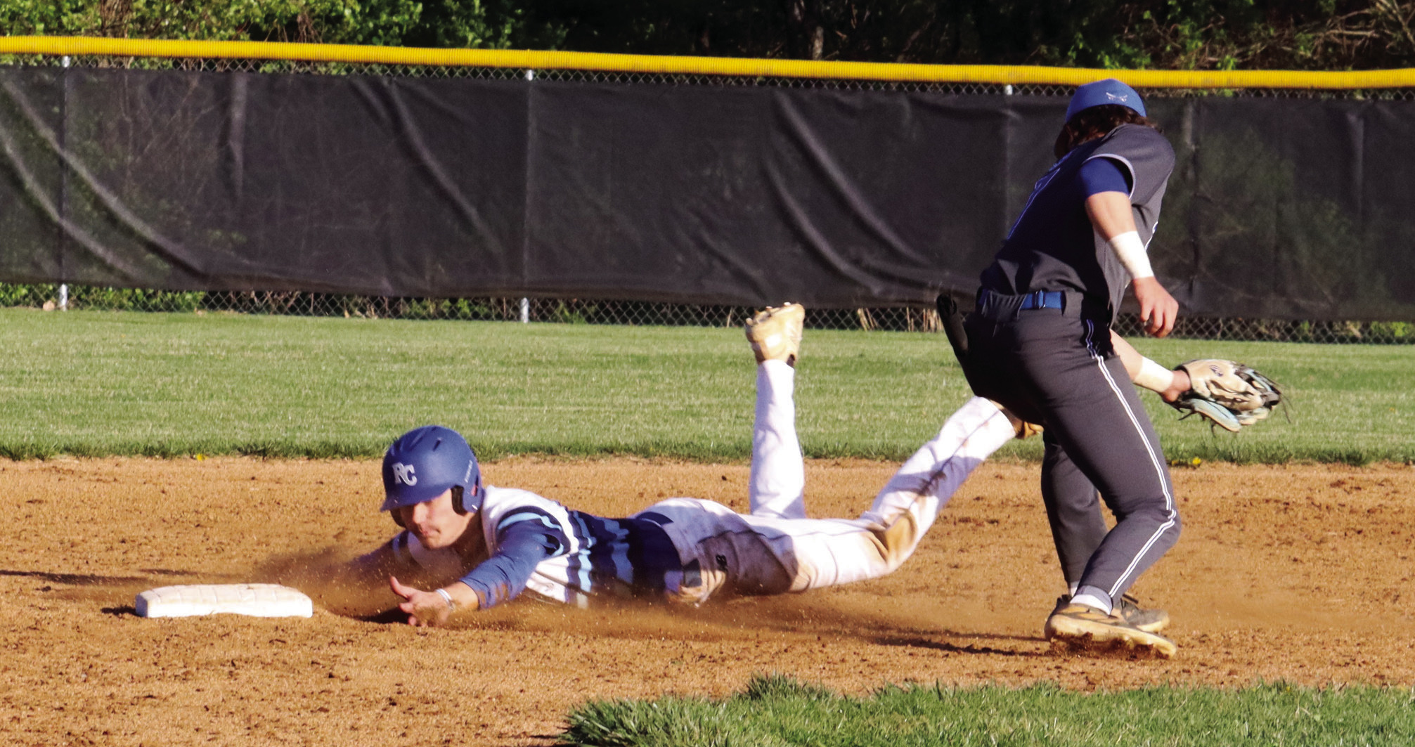 WILDCAT SENIOR Clay Irvine slides into the bag to beat the tag from a Spotswood infielder. Irvine recorded one hit, one walk and one RBI, and he scored one run. (Stephanie Mikels Blevins photo)