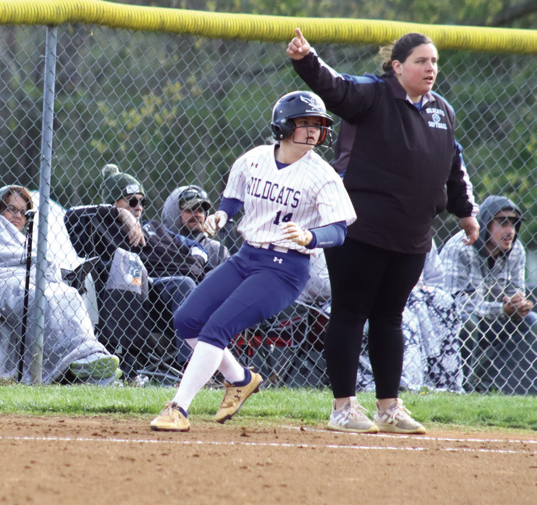 RC JUNIOR Landrey Campbell rounds third base as Wildcat assistant coach Cari Mayton signals to another baserunner. Campbell recorded two hits. (Stephanie Mikels Blevins photo)