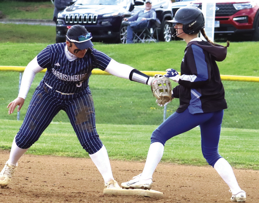 WILDCAT JUNIOR Gabby Brown keeps her foot on the bag to beat the tag by the Harrisonburg infielder. Brown had one RBI. (Stephanie Mikels Blevins photo)
