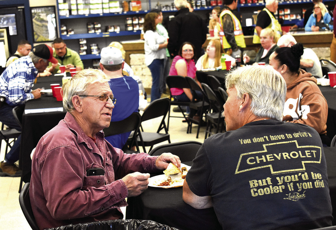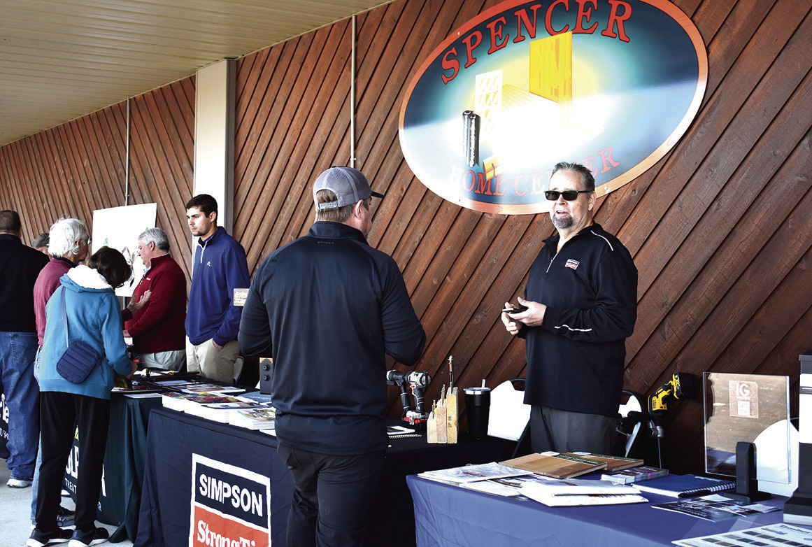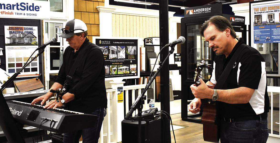 The public was invited this past Thursday to a customer appreciation event at Spencer Home Center on North Lee Highway. AT TOP, customers help themselves to the buffet of fried chicken, potato salad, rolls and other delights provided by Kenney’s catering. TOP LEFT, vendors talk about their products on the verandah outside the home center. BOTTOM RIGHT, customers enjoy the good food and conversation. BOTTOM LEFT, Keith Bryant and Kevin Wallace keep the crowd entertained with a selection of popular songs, some penned by Bryant himself (Joann Ware photos)