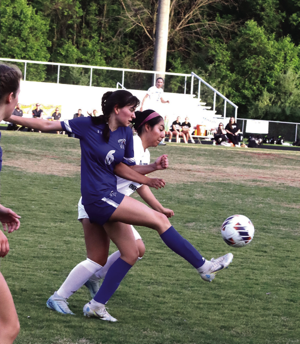 RC SENIOR midfielder Sofia Smith kicks the ball forward while closely guarded. Smith scored a goal late to tie the game 3-3 before TA scored the winning goal. (Stephanie Mikels Blevins photo)