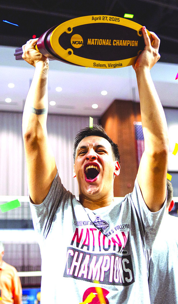 AT FART LEFT, SVU sophomore Gehrig Tolman leaps to set as senior teammate Kristo Blanchin (1) watches at the net during the semifinals. INSET PHOTO, Blanchin rejoices while hoisting the trophy after the Knights won the national title. (SVU photos by Erik Flores)