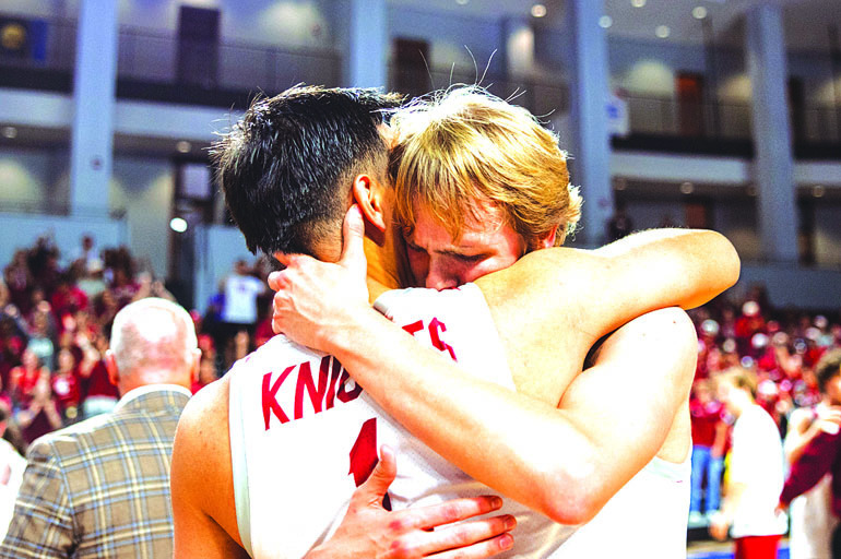 KNIGHT SENIOR Christian Sheaffer (right) embraces senior teammate Kristo Bianchin after SVU’s championship win. In the finals, Sheaffer, who was named the tournament’s Most Outstanding Player, led the Knights with 13 kills and had 11 digs, while Blanchin recorded eight kills. (SVU photo by Erik Flores)