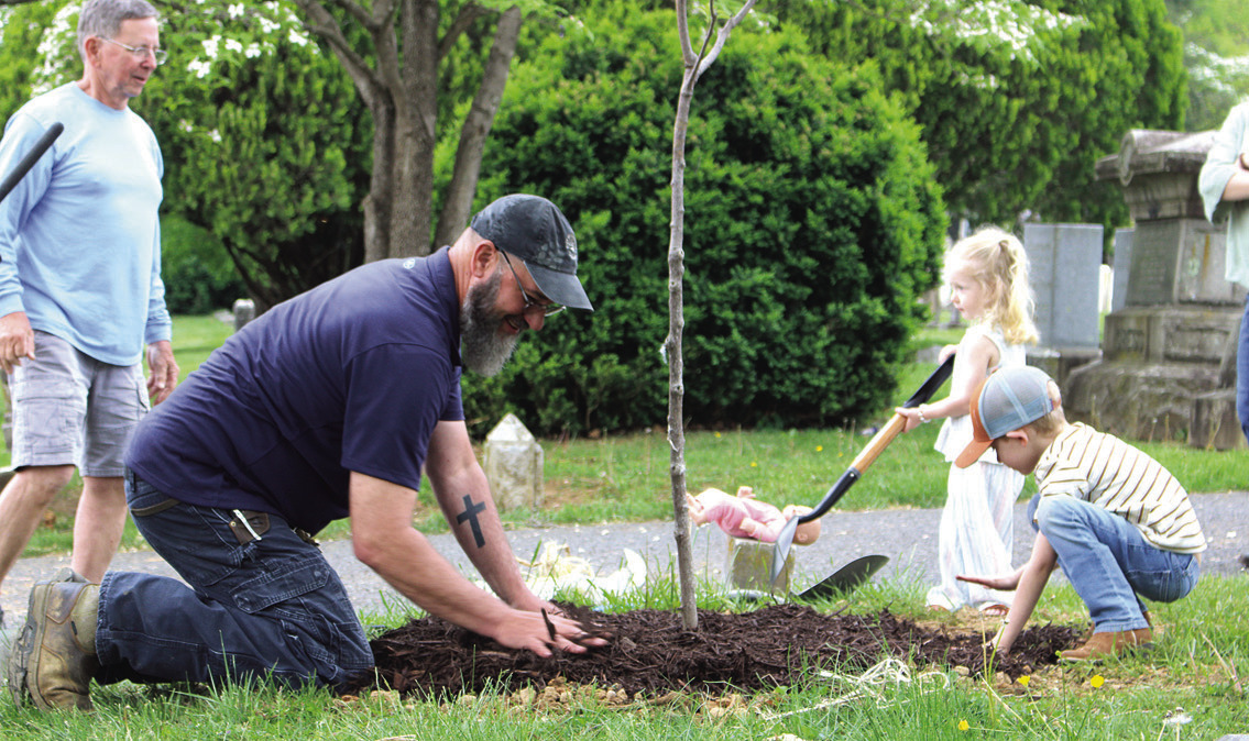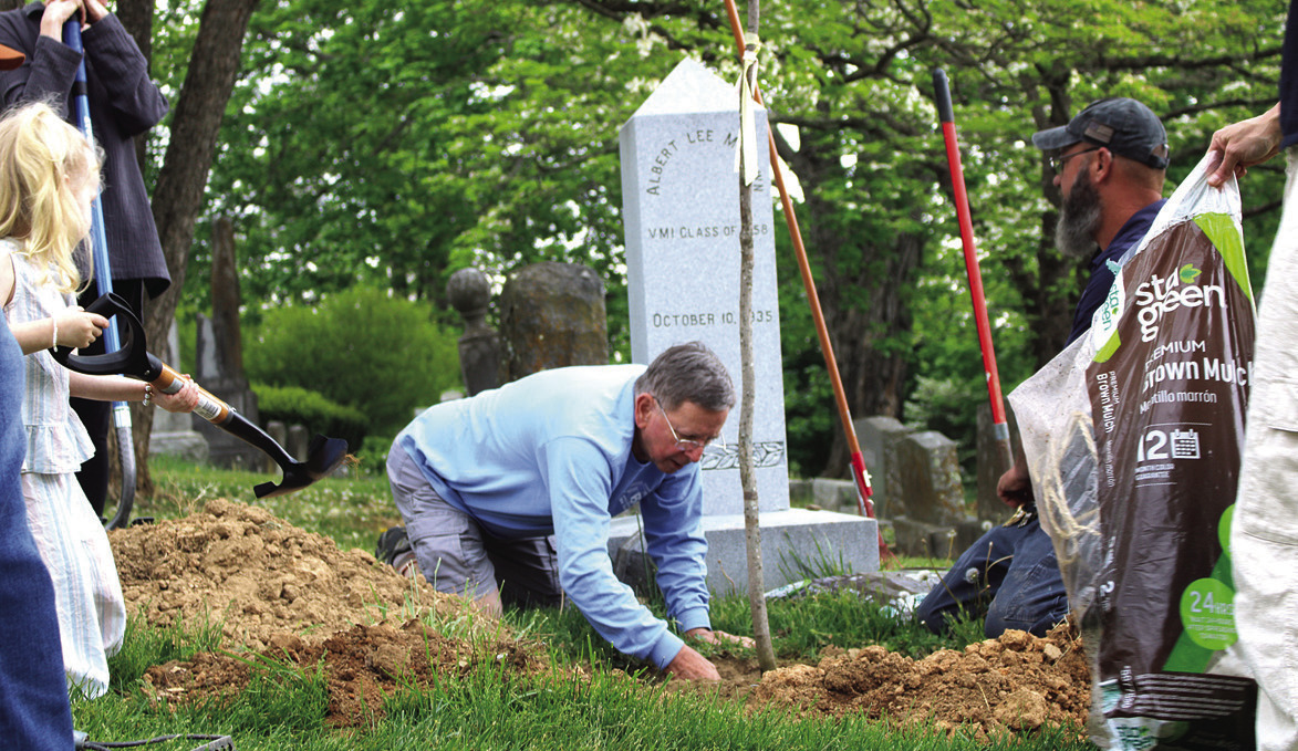 Citizens of all ages gathered at Oak Grove Cemetery on Thursday, April 26, with Lexington public works to plant trees in celebration of Arbor Day. Children from the Boomerang Gang homeschool co-op joined community volunteers to dig holes and pat down soil around newly planted saplings. Ray Ulrich, Lexington’s city arborist (bottom right), Dave Agnor with the Rockbridge Area Master Gardeners (below) and Markus Ruley (at right) with public works were among those guiding the planting. Five native Dogwood trees were planted to replace two that have died and three that are failing. (photos by Scotty Dransfield)