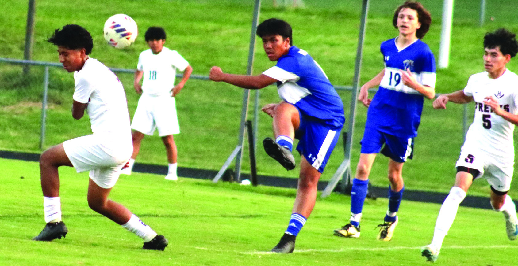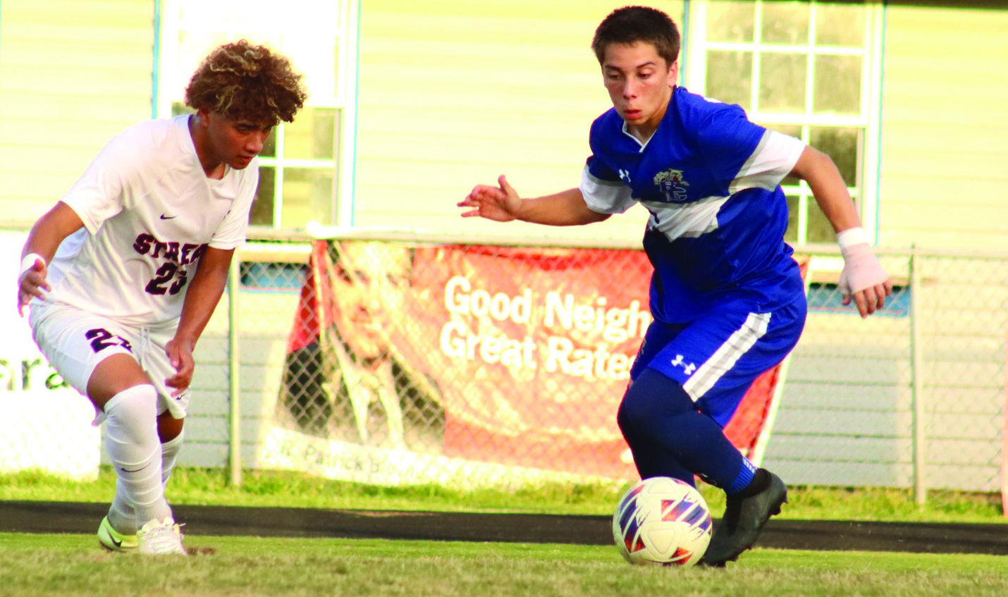 WILDCAT JUNIOR midfielder John David kicks the ball down the field while senior teammate Brennan Roeder (19) watches. (Stephanie Mikels Blevins photo)