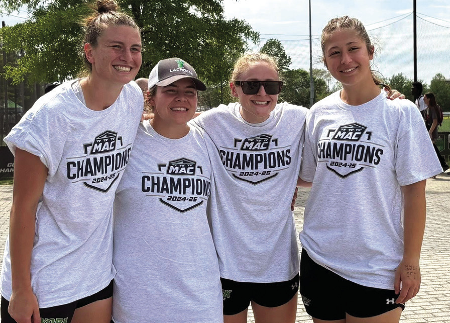 LIBERTY UNIVERSITY women’s lacrosse players Rachel Hines (left) and Kendall Nye, both RCHS alumna, celebrate with their trophy after helping the Flames win the Atlantic Sun Conference championship on Saturday and secured their first-ever bid to the NCAA Division I tournament. Hines, a sophomore goalie, was named to the all-tournament team, while Nye, a junior defender, dished out the first assist of the game. (Susan Nye photo)