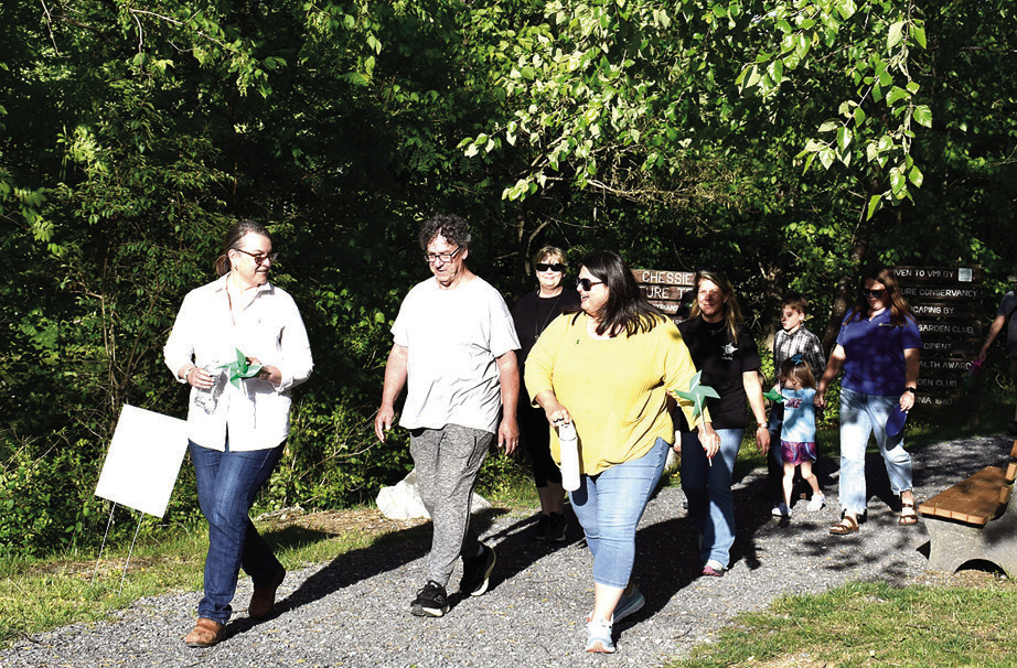 Community members came together at Jordans Point Friday for a walk to raise awareness about mental health. The event was organized by Rockbridge Area Community Services and Rockbridge Area Prevention Coalition. ABOVE, Lexington Police Chief Angela Greene and Rockbridge County Sheriff Tony McFaddin lead a pack of walkers around the athletic field at the park. (Joann Ware photo)