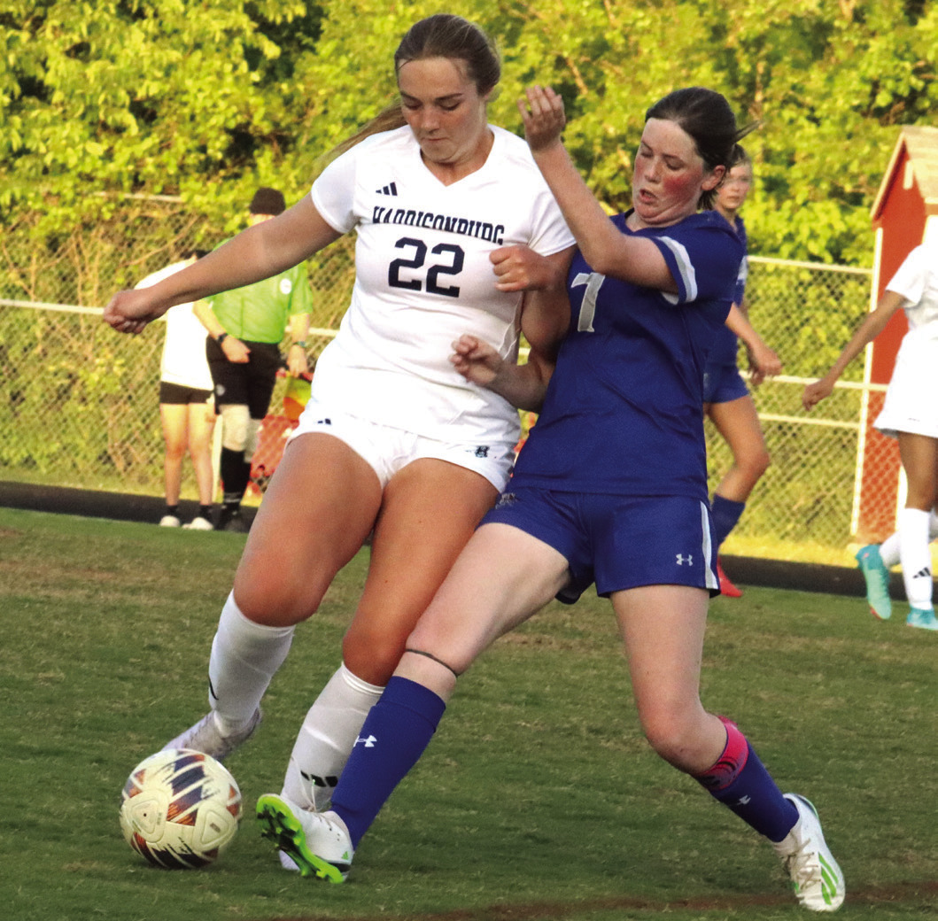 HARRISONBURG’S MOLLY Ludwig (22) tries to keep the ball away from RC senior Lydia Kendall, who scored one goal and had an assist. (Stephanie Mikels Blevins photo)