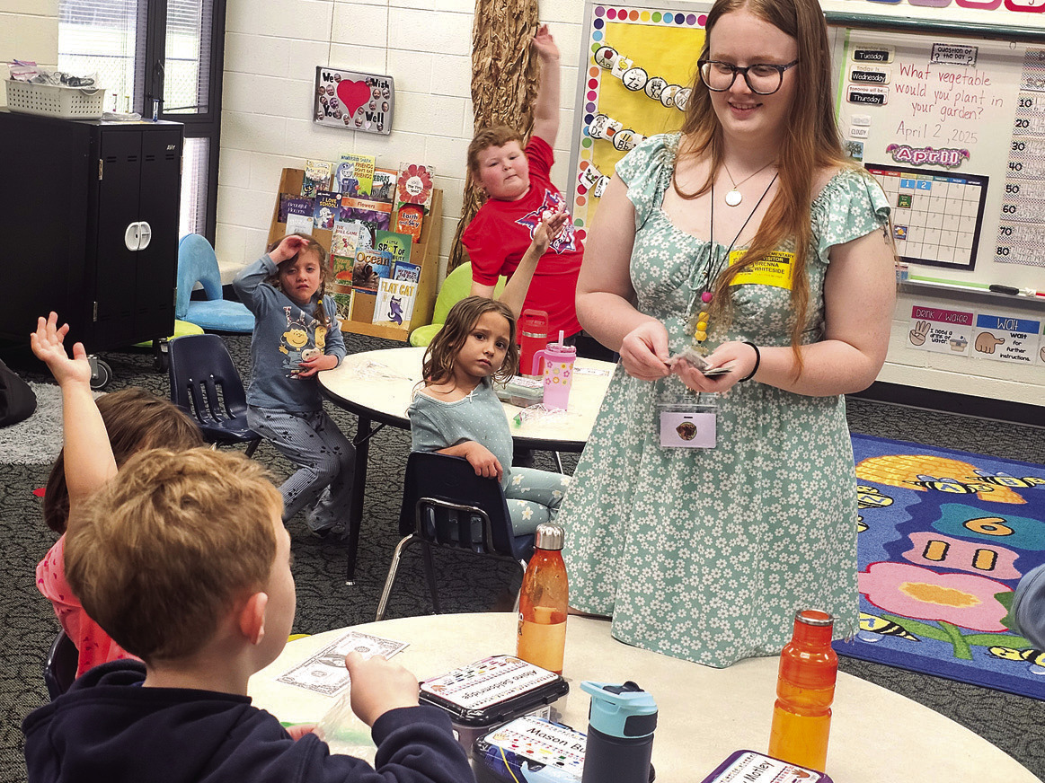 BRENNA WHITESIDE teaches a lesson on money to students at Fairfield Elementary School as part of the “Teen Teach-in” event.