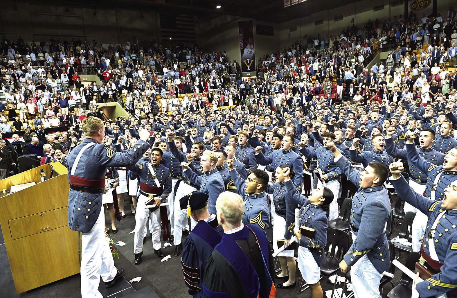 AT LEFT, Turner Gallo, president of the class of 2025, leads the graduates in an Old Yell before they depart post. ABOVE, Gen. Darren McDew ’82 delights his audience during the commencement ceremony in Cameron Hall. (VMI photos by H. Lockwood McLaughlin)