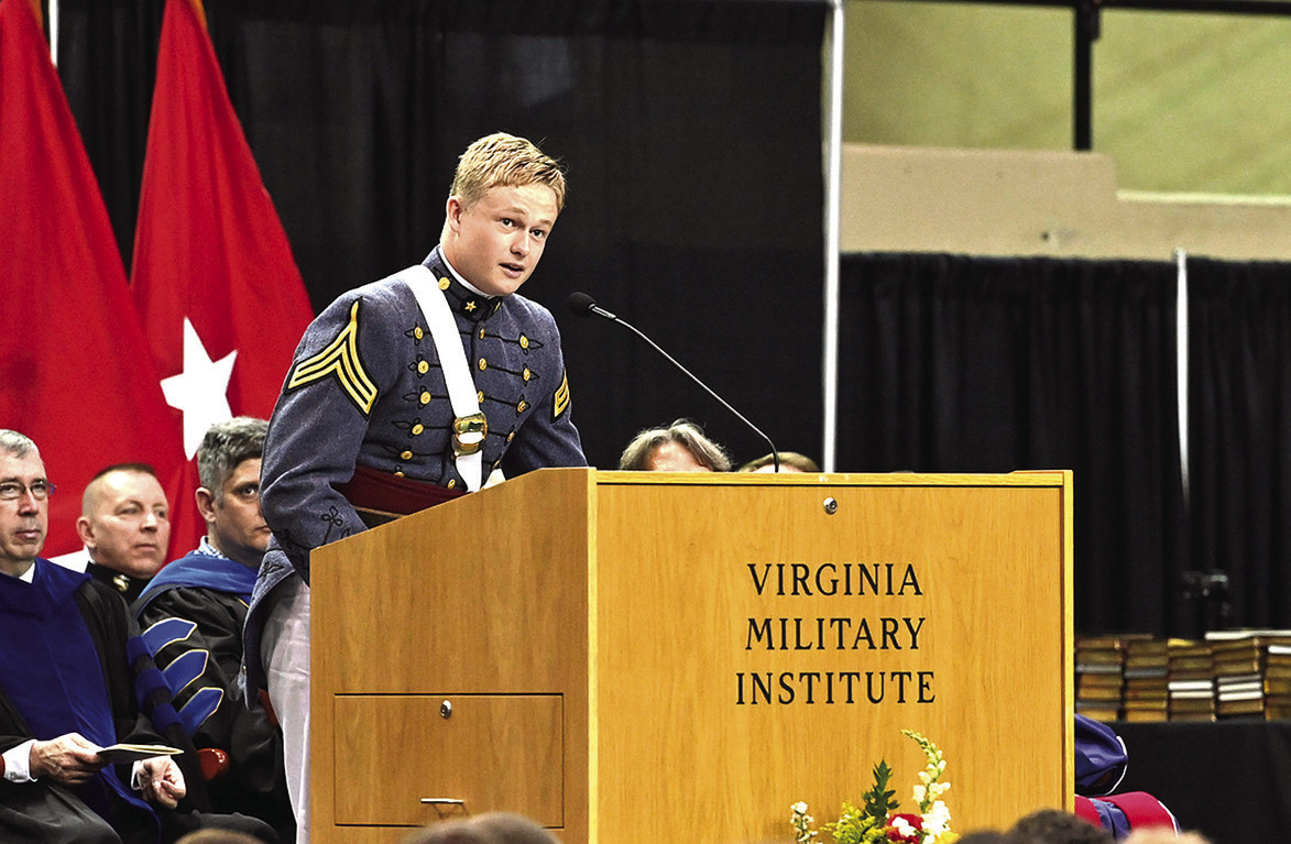 He spoke on the tools the VMI system provides, which remind him of the biblical passage in the Book of Matthew, chapter seven. “Four years of struggle, hardship, and choosing the hard right over the easy wrong, have allowed for the very foundations of our character to be built on solid rock,” he said. “I don’t doubt that when the rain comes down, the rivers rise, and the winds blow, those who chose the easier path will quickly crumble under the burden of the weight they may be asked to carry.” He reflected that the VMI system breaks rats down and builds them back up to become cadets with humility, grit, tenacity, and integrity.