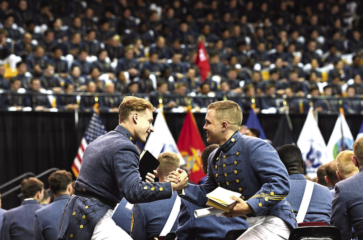 TWO CADETS congratulate each other after receiving their diplomas. (VMI photo by H. Lockwood McLaughlin)