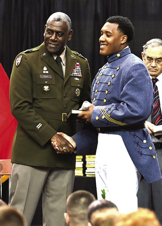 TERRELL JACKSON receives his diploma from Maj. Gen. Cedric T. Wins ’85. (VMI photo by H. Lockwood McLaughlin)