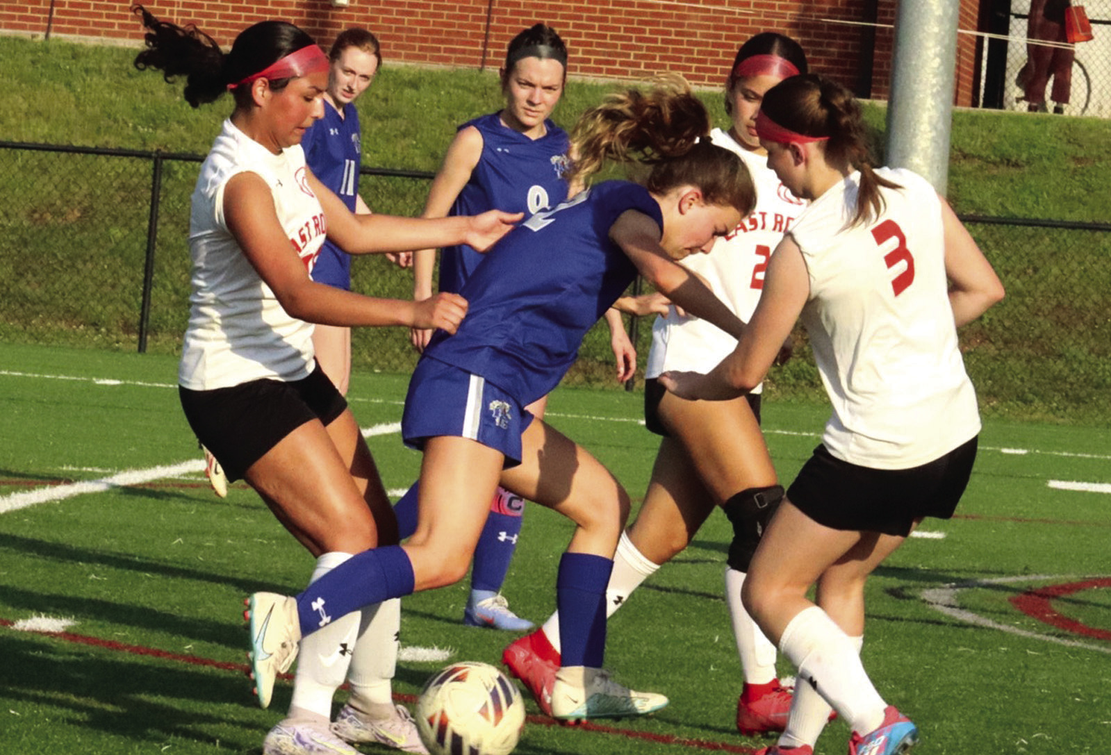 AS THREE ER players surround her, RC sophomore midfielder Emily Jones dribbles the ball while teammates Addision Littlefair Small (11) and Madelyn Jones (center) watch. (Stephanie Mikels Blevins photo)