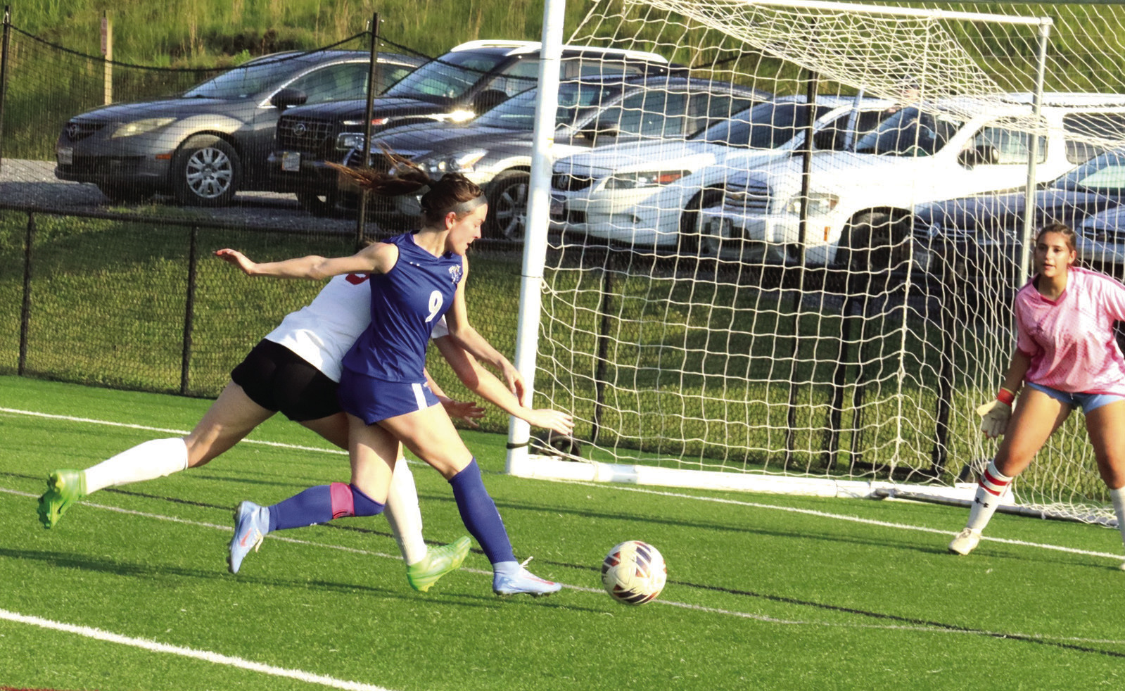 WILDCAT SENIOR forward Madelyn Jones dribbles the ball toward the goal as an ER player tries to stop her and ER goalkeeper Camilla Suarez Nunez awaits her shot. Jones scored two goals. (Stephanie Mikels Blevins photo)