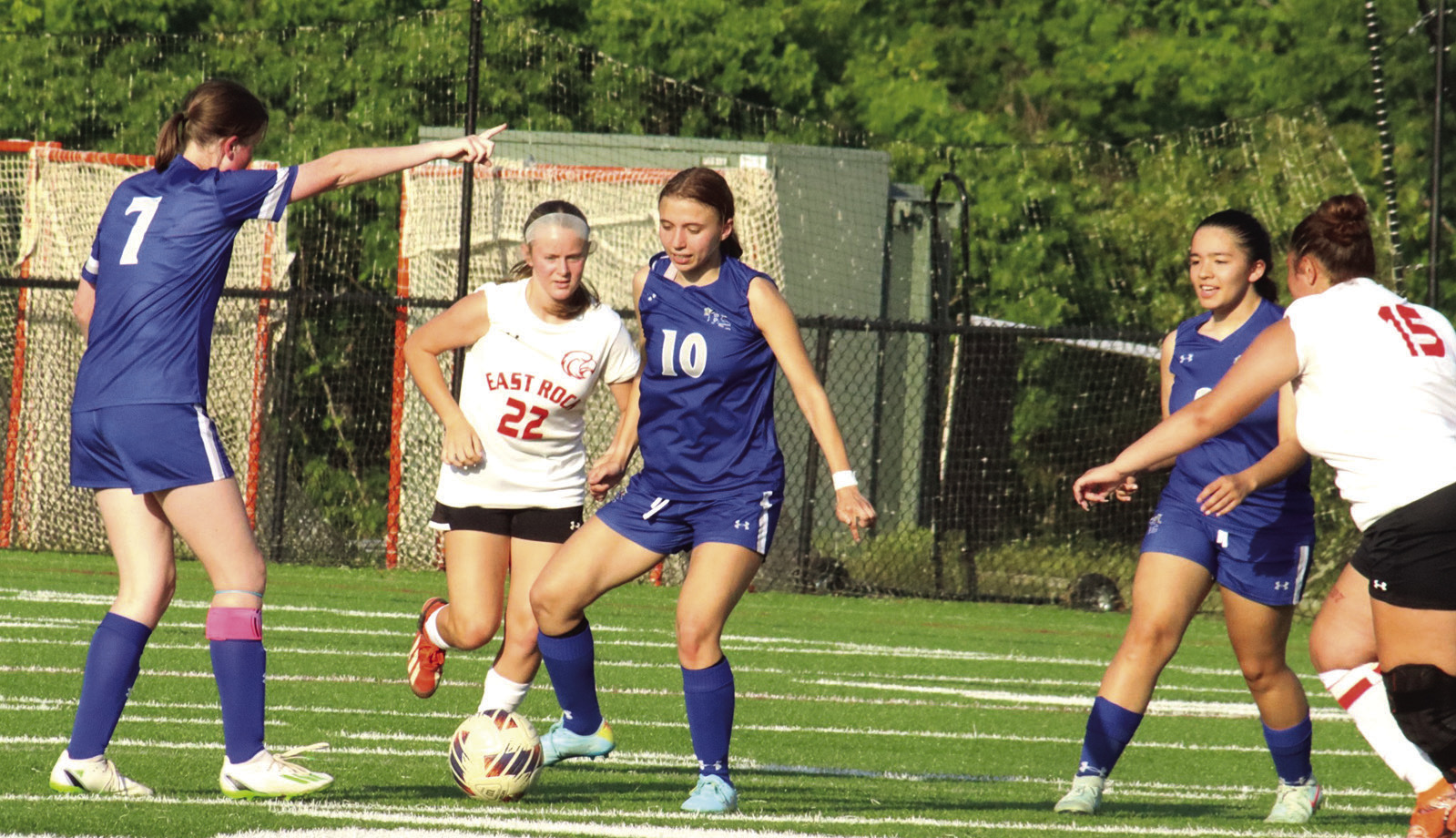 RC SENIOR defender Brooke Eichelberger (10) maintains possession of the ball while senior teammate Lydia Kendall (7) signals to her and ER’s Addison Terry (22) approaches. Watching nearby are RC junior Briana Itehua-Lopez (second from right) and ER’s Makayla Darcus (15). (Stephanie Mikels Blevins photo)