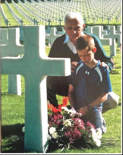 GRADUATING cadet Thomas Langston (seen in portrait at right) raised his hand for his first salute after commissioning last week to World War II veteran and family friend Jack Moran (in photo at top). As a youth in 2011, Langston had visited the grave of his great-great-uncle’s grave, Tommy Langston, with Moran in France (above photo).