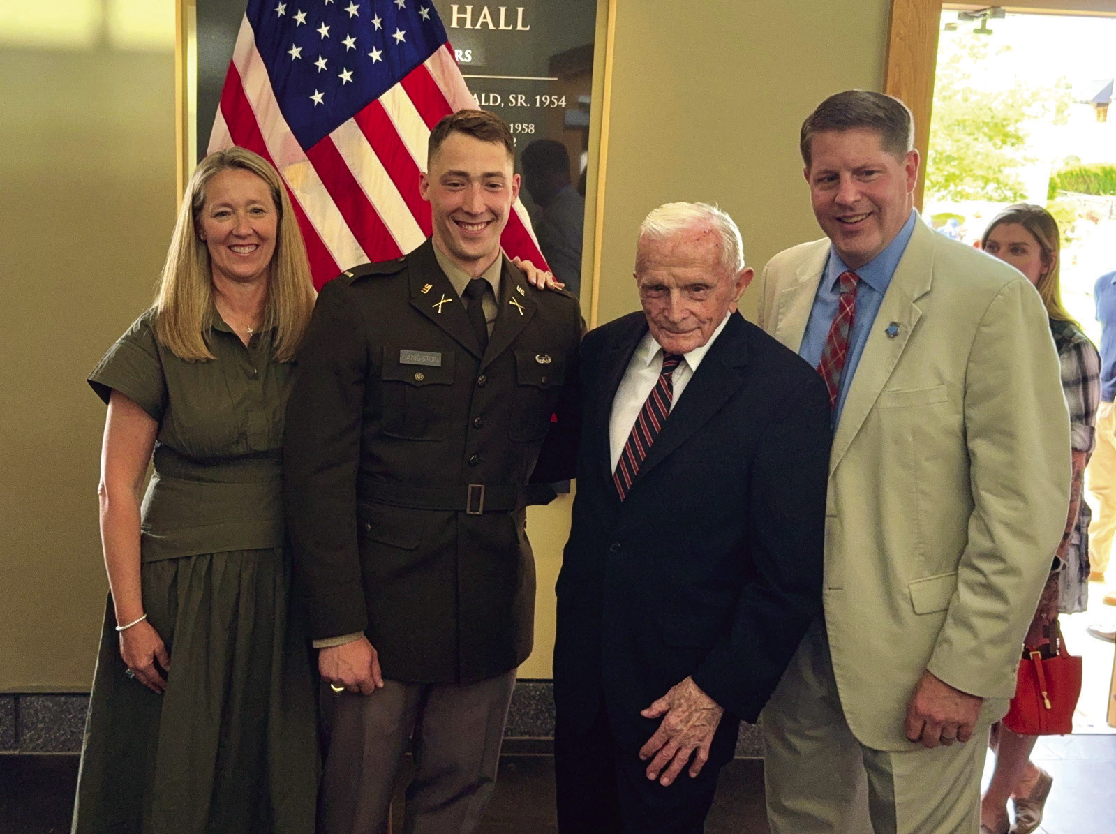 AFTER THE COMMISSIONING ceremony, Thomas Langston poses with his mother, Beth Langston, World War II veteran Jack Moran, and his father, Tom Langston.
