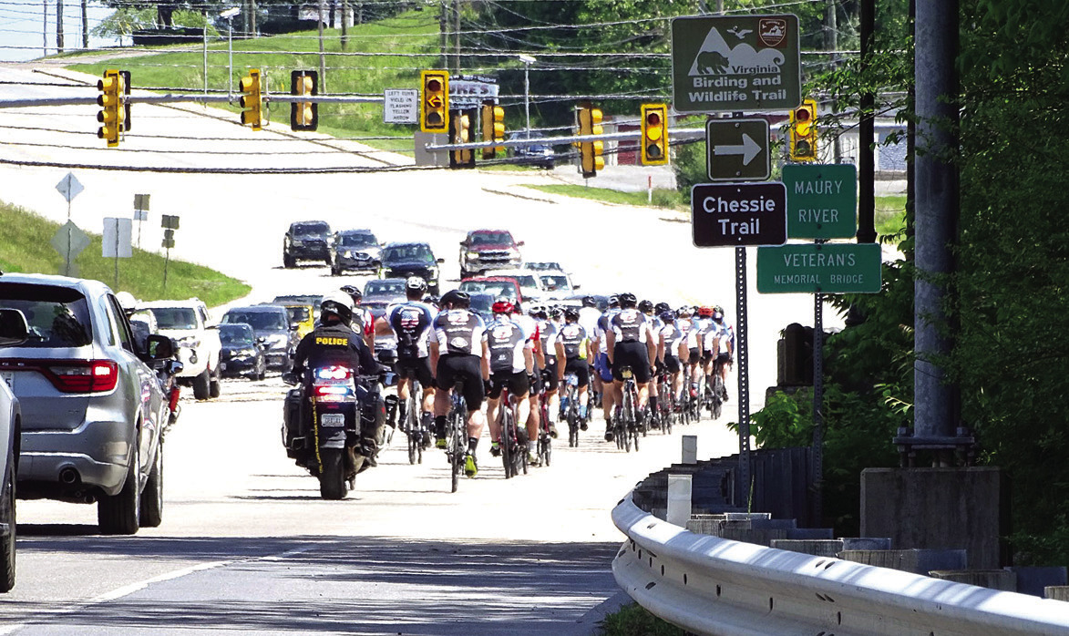 Approximately 85 bike riders and support personnel made a stop in Jordans Point Park in Lexington on Saturday, May 10, as part of the Law Enforcement United Tough Riders annual 300-mile bike ride from Roanoke to Washington, D.C., for Police Week, which includes Police Memorial Day, May 15. The riders have been hosted by the Lexington Police Department for over 10 years, with the event featuring the reading of a synopsis of the local heroes who lost their lives in performance of their duties. The riders were joined by surviving family members, as well as officers from the Buena Vista Police Department, Rockbridge County Sheriff’s Office and VMI Police. AT LEFT, Lexington Police Chief Angela Greene speaks to the assembled bikers, noting that “the fallen heroes’ legacy lives on in every mile they ride.” AT RIGHT, the bikers, many of whom are law enforcement officers or survivors of fallen officers, depart Lexington, heading north on U.S. 11. (photos courtesy of the Lexington Police Department)