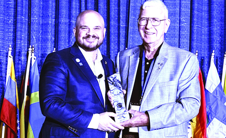 WOODY SADLER (right) receives the Ron Ferrill Humanitarian Award from District 7570 Governor Bret Hrbek from Front Royal.