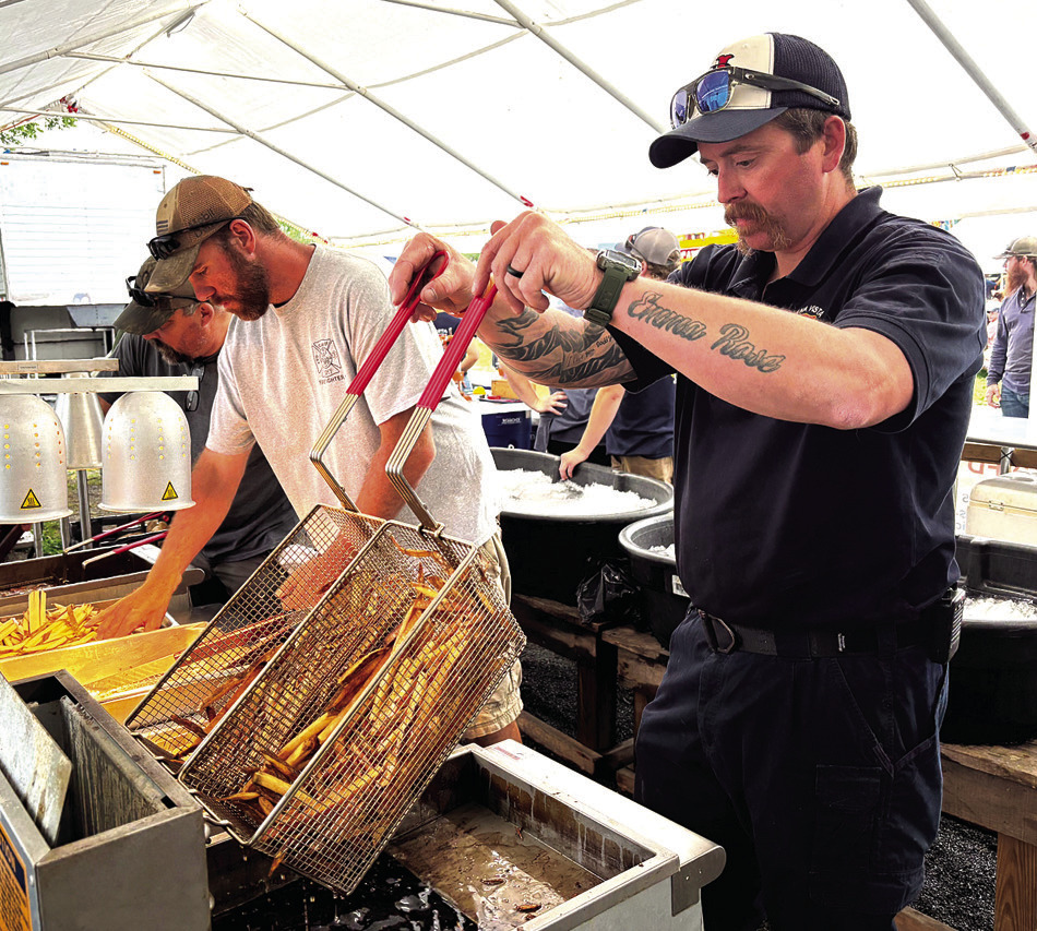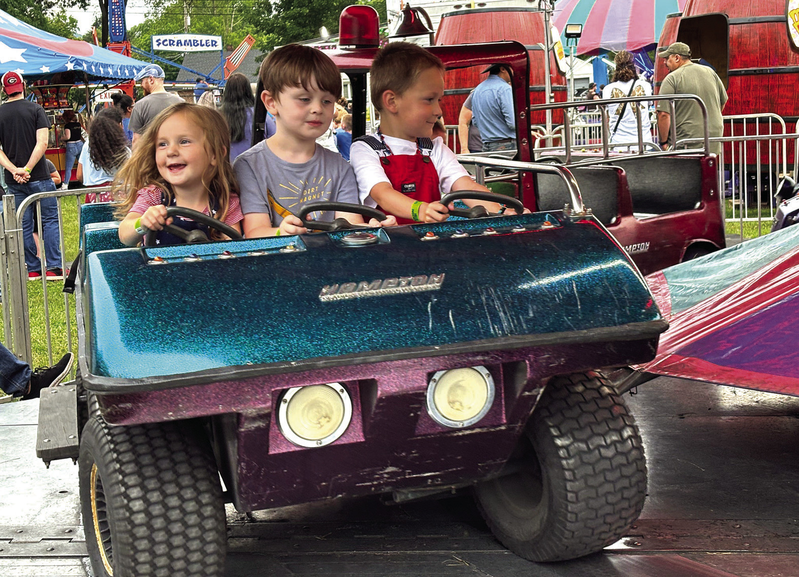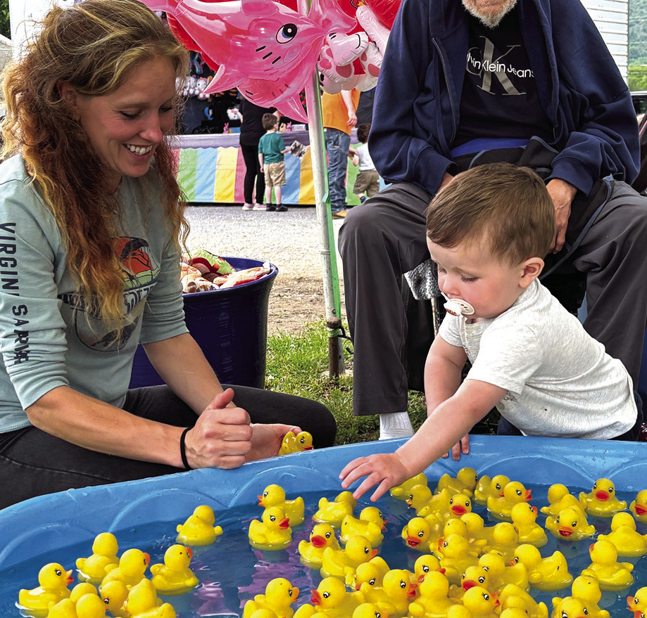 The first local carnival of the 2025 season was held in Buena Vista last week as the fire department brought rides, music, food and games to Camden Field. AT LEFT, children enjoy one of the kiddie rides. AT BOTTOM LEFT, serving up fries are Chase Coffey (in foreground), along with Dalton Argenbright and Dwayne Duff. BELOW, young Roman Fitzgerald reaches for a rubber duck as his mother Sarah Fitzgerald looks on. (Mary Woodson photos)