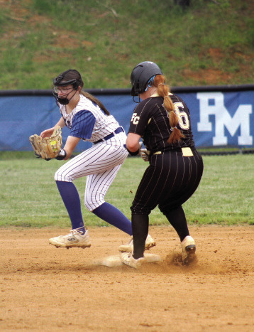 FIGHTING BLUE sophomore second baseman Kendall Painter fields the ball as Fort Chiswell’s Katelyn Frazier reaches the bag. At the plate, Painter had an RBI double to bring in PM’s only run. (Ronnie Coffey photo)