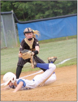 PM FRESHMAN Sara Dudley slides into third base to beat the tag by Fort Chiswell’s Kimberlyn Hart. (Ronnie Coffey photo)