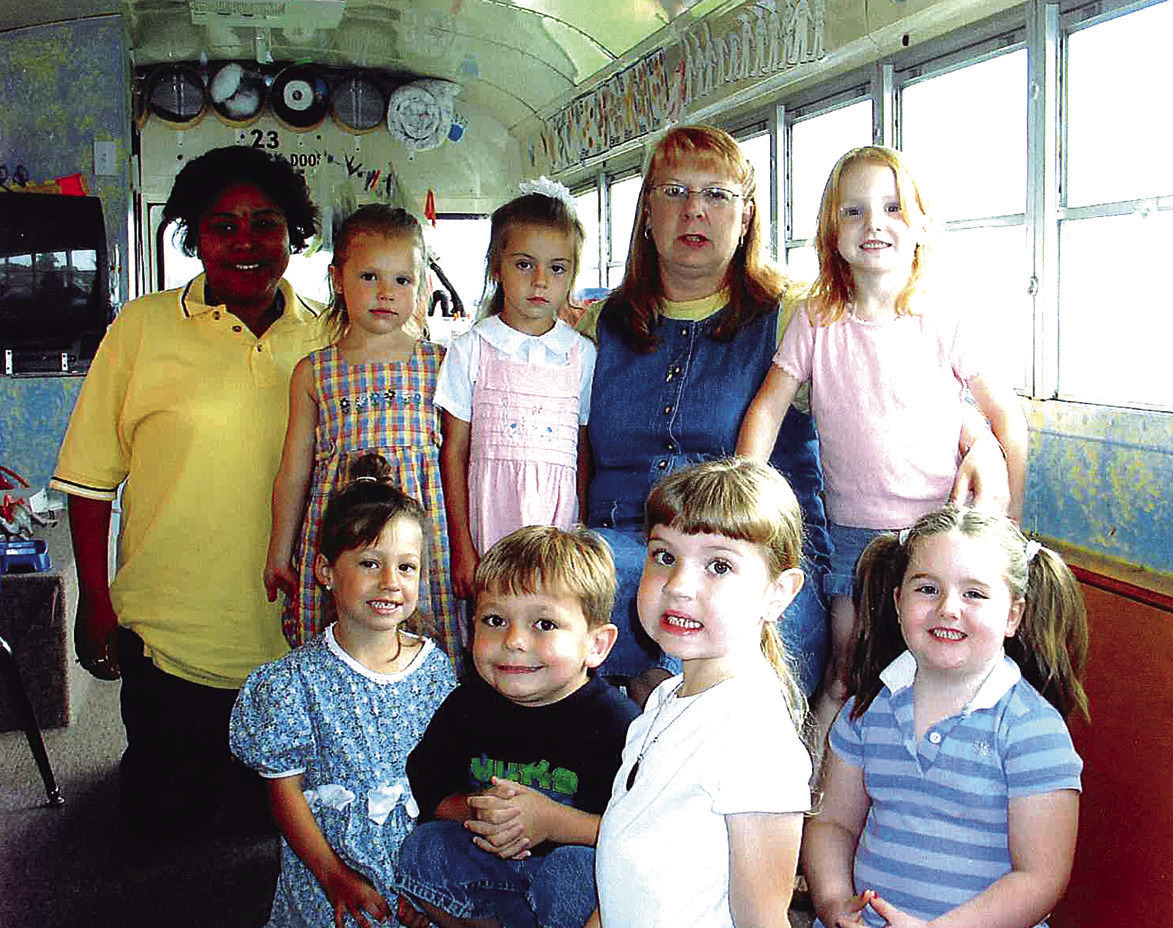 PRESCHOOLERS from the 2003-2004 school year are aboard the Preschool on a Bus with their teachers, Monica Dock (back row, at left) and Edwina Shafer (back row, second from right).