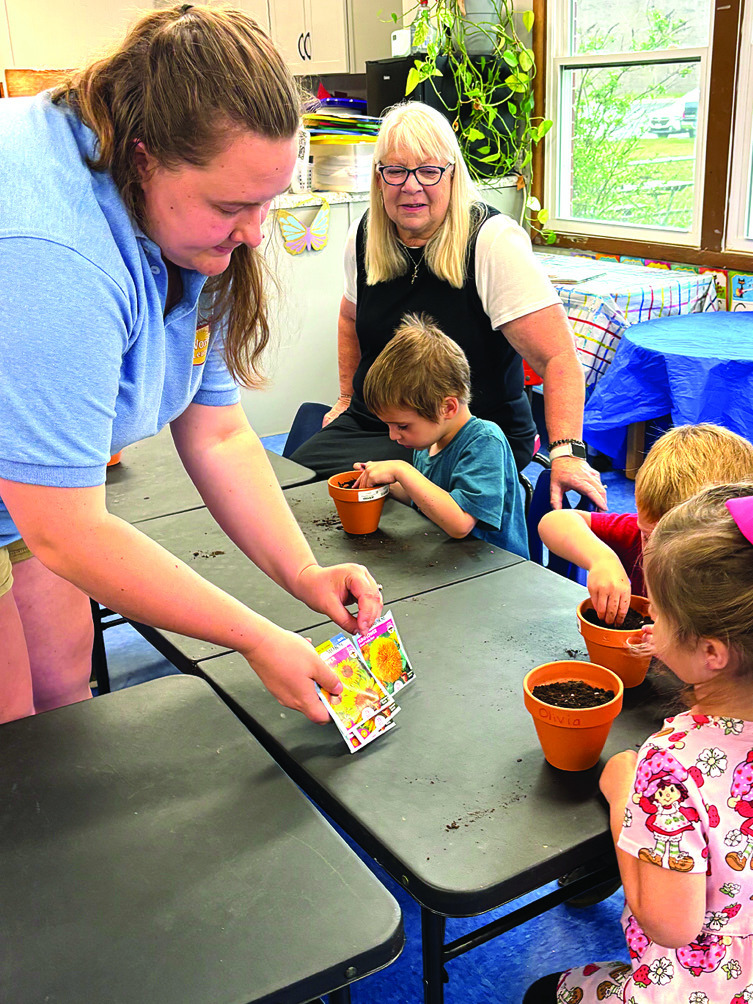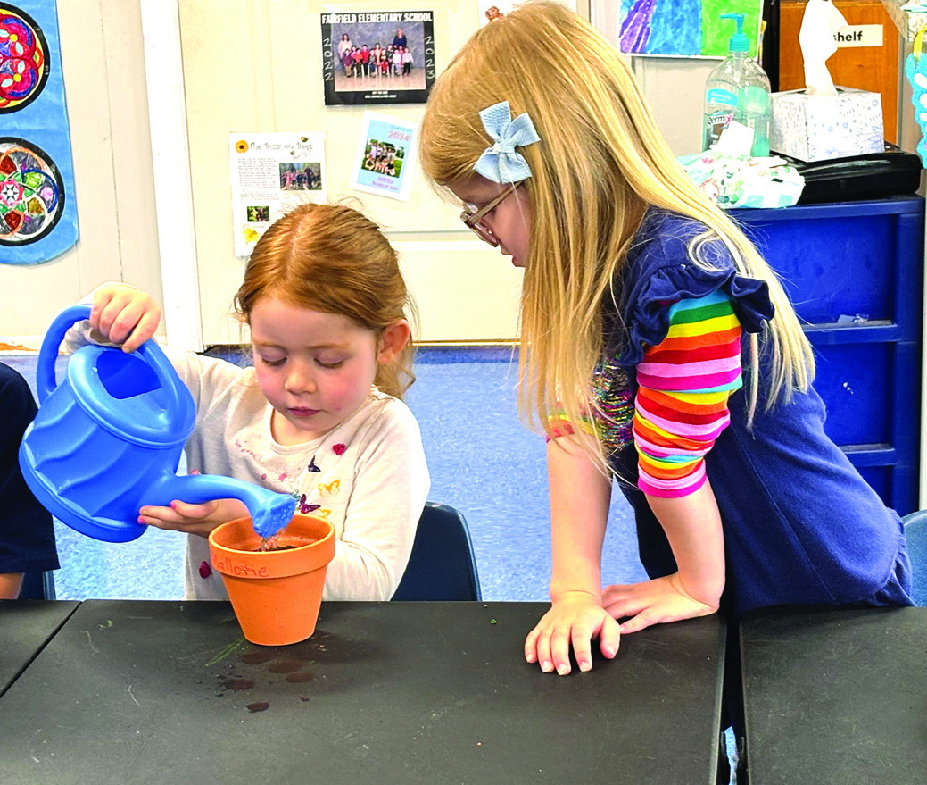 A COUNTY PRESCHOOL student waters a plant she and her classmates had planted during the agricultural activity led by Ashley Hostetter with Rockbridge County Farm Bureau Women’s Leadership last month. (Mary Woodson photo)