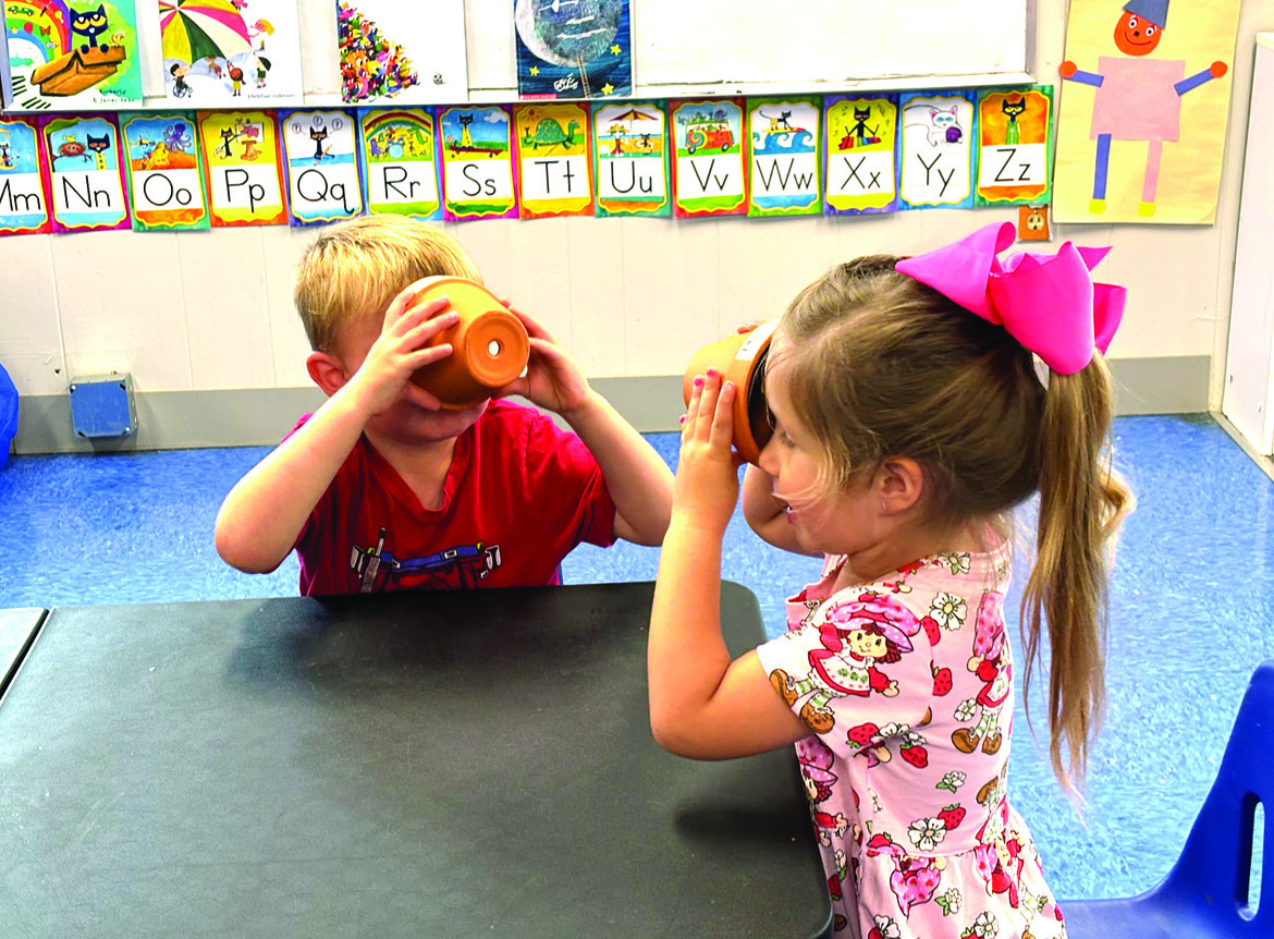 BECAUSE KIDS can’t help being kids, sometimes flower pots can also be telescopes. This was one of the scenes from last month’s visit by Ashley Hostetter to the Fairfield program. (Mary Woodson photo)