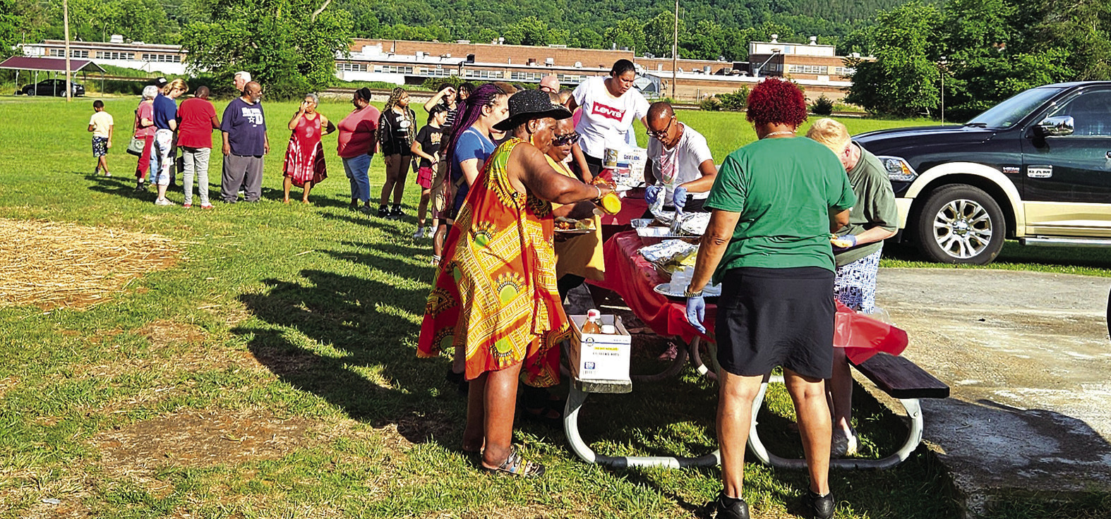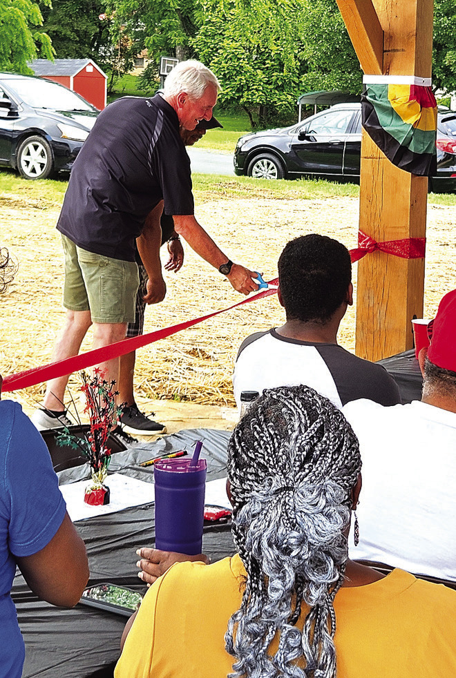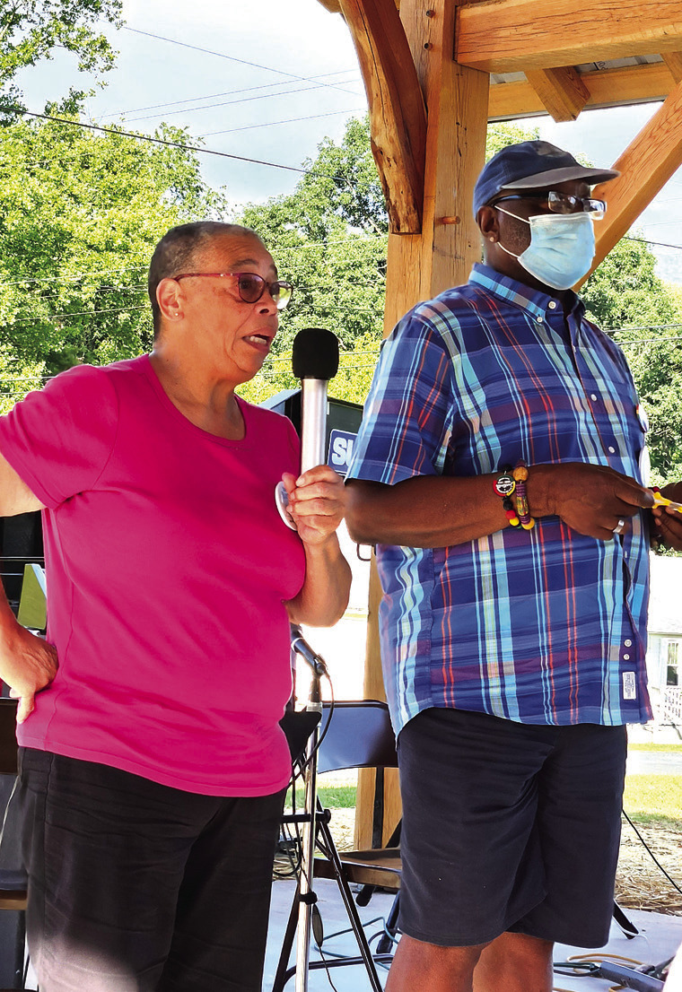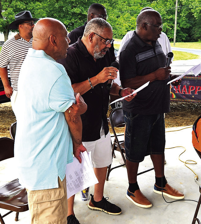 The town of Glasgow celebrated Juneteenth at the Thompson Community center this past Saturday. The annual commemoration of the ending of slavery in the United States also included a dedication of the town’s new pavilion. Dave Van Osten and Preston Sledd (TOP LEFT) were recognized for their part in bringing the new pavilion to a reality and were asked to cut the ribbon at the pavilion’s official opening. (TOP RIGHT) musicians from Union Baptist Church provided musical entertainment Saturday. The Men’s Chorus from Union Baptist (AT FAR LEFT) was also on hand. (AT IMMEDIATE LEFT), Marquita Dunn and Reginald Early, pastor of Randolph Street Methodist Church, spoke on behalf of the local chapter of the NAACP. (AT BOTTOM) food was served by members of the Glasgow Concerned Citizens. (Carolyn Bradley photos)