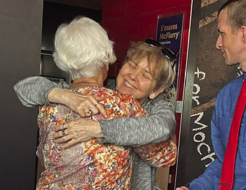The Lexington McDonald’s held a birthday party for Judy Clements on June 17 and invited the entire community to help her celebrate. Miss Judy, as she is known to customers, has been a McDonald’s employee for 18 years. AT LEFT, Miss Judy prepares to cut a slice of one of the cakes at her party. ABOVE, Miss Judy gets an appreciative hug as David Bruce, area supervisor for McDonald’s, looks on. (April Mikels photos)