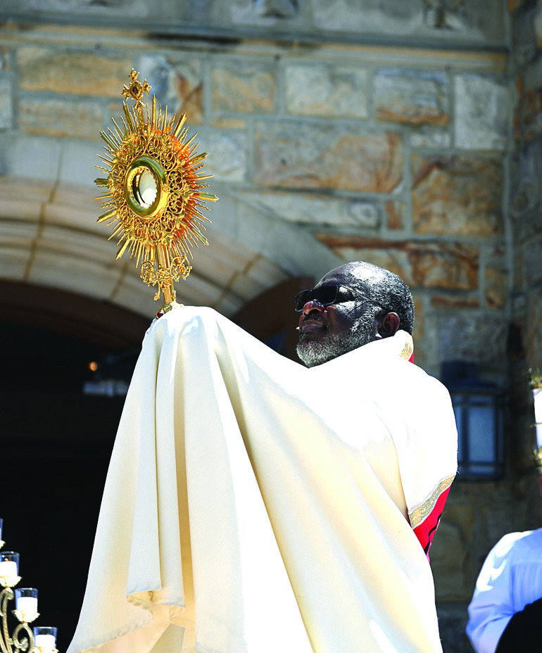 On Sunday, June 22, the 10:30 a.m. Mass at St. Patrick Catholic Church for the Solemnity of Corpus Christi concluded with a traditional Procession around the church block, honoring the Blessed Sacrament of the Eucharist. It was led by Father J. Maxwell Appiagyei, pastor, who blessed the city of Lexington at the solemn benediction that followed on the church’s piazza.