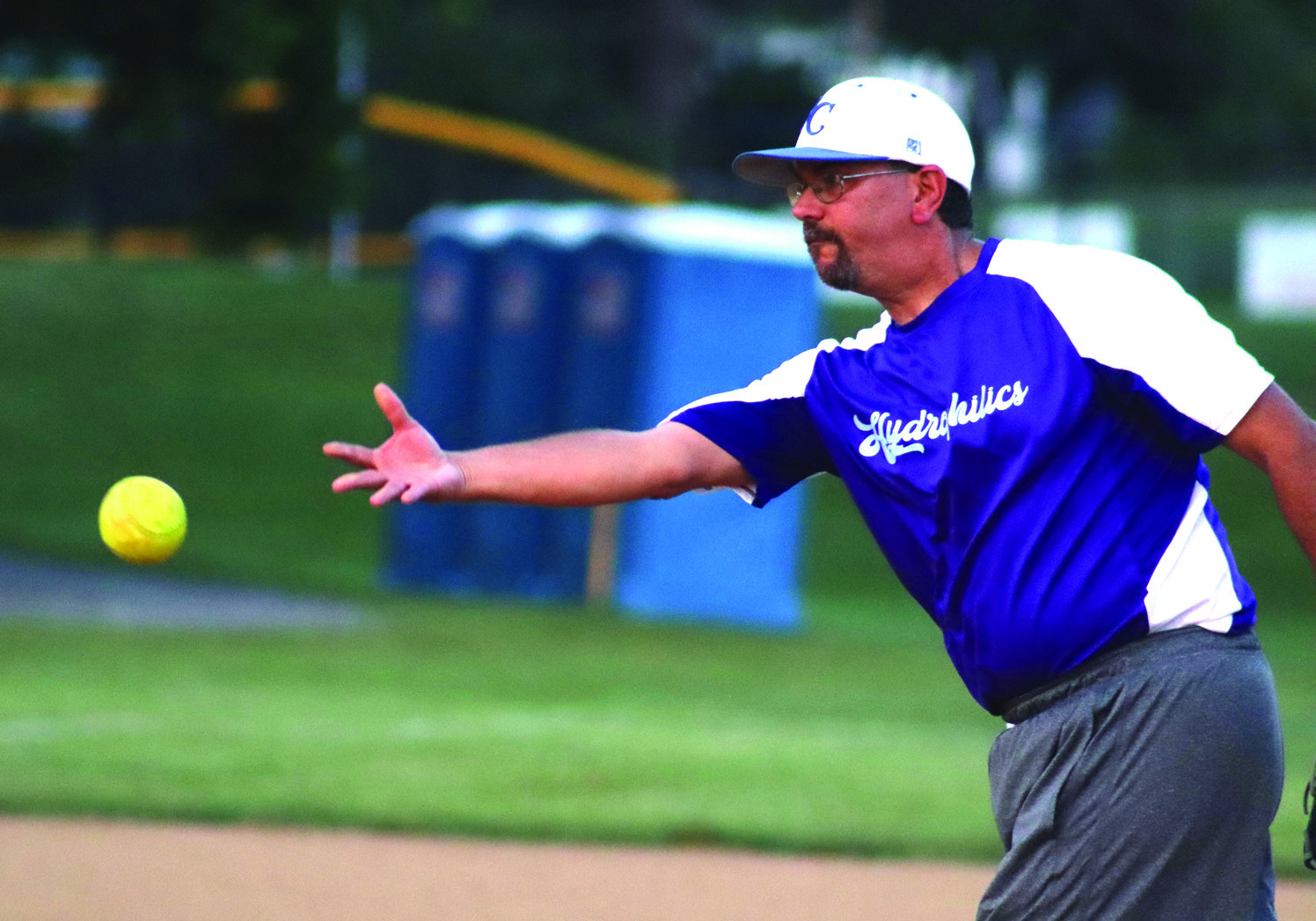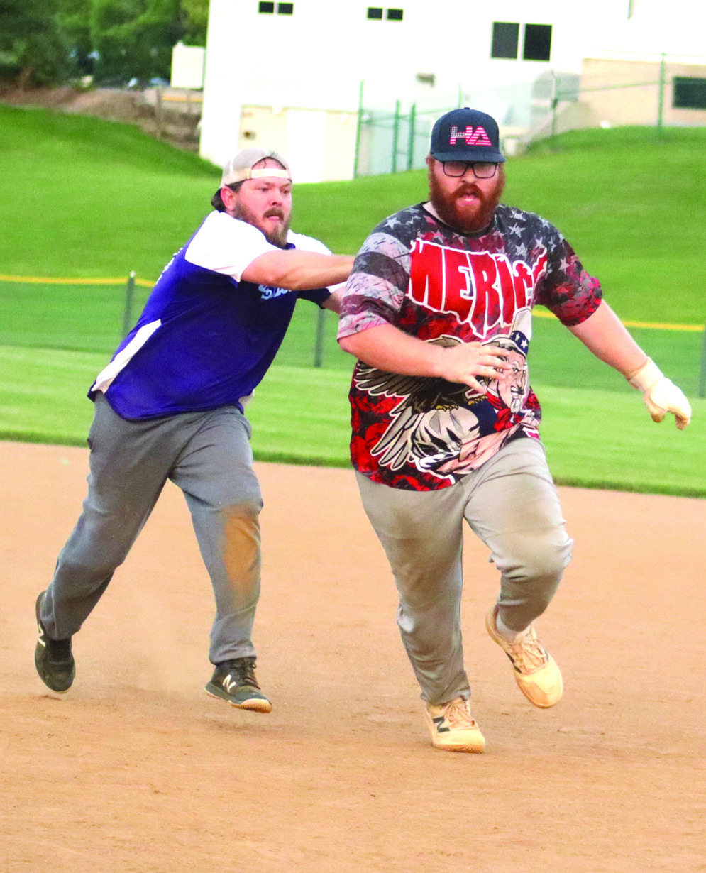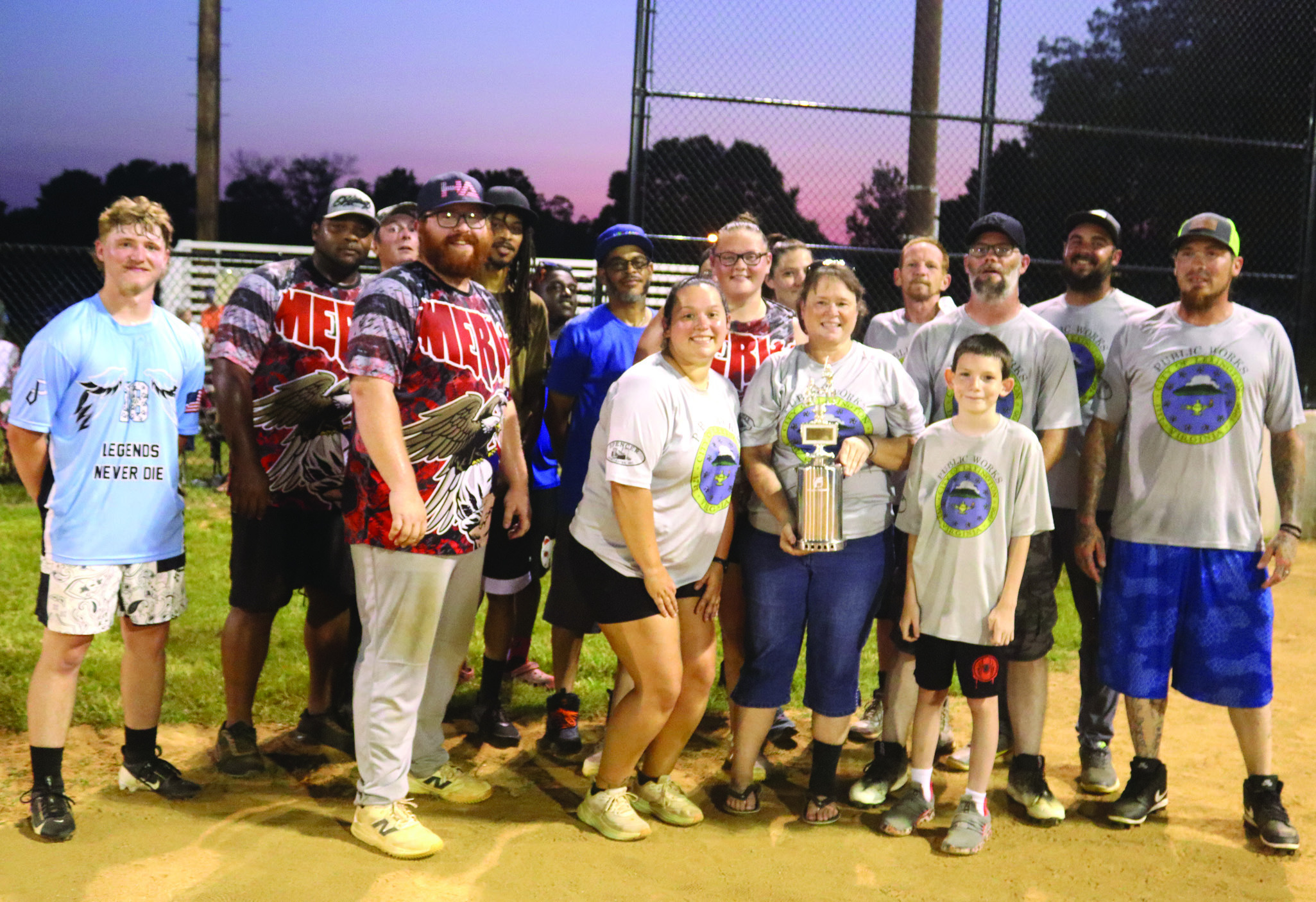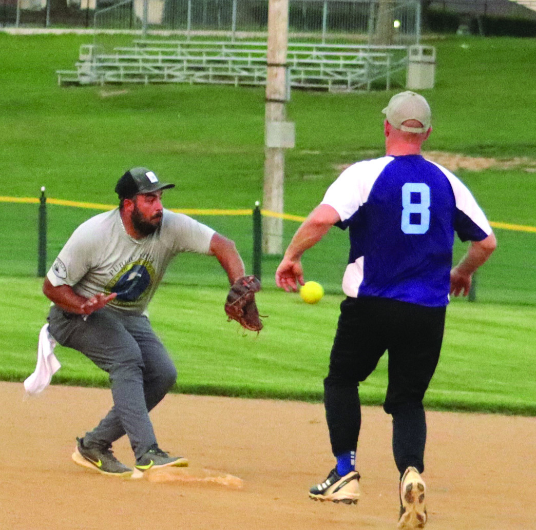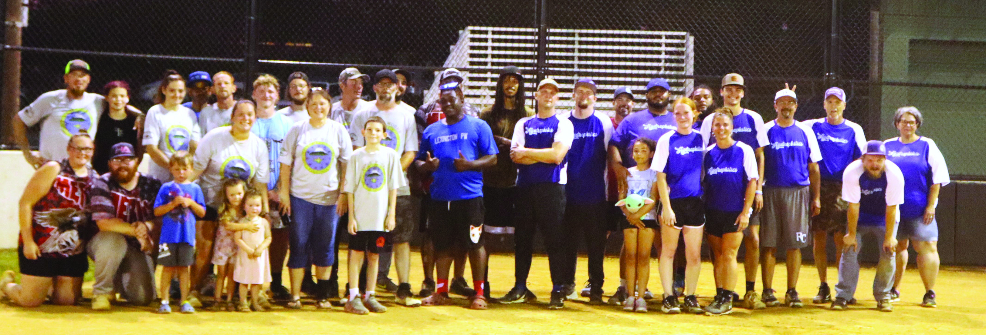 MEMBERS OF the LPW team celebrate with the Sump Pump trophy. (Stephanie Mikels Blevins photo)THE LPW team and the Hydrophilics gather with family members on Brewbaker Field after the game. (Stephanie Mikels Blevins photo)JAMES PERRY of the Hydrophilics tags out the LPW’s Chris Woody. (Stephanie Mikels Blevins photo)GINNY HOSTETTER, daughter of LPW team member Jani Hostetter, sits with the Sump Pump trophy. (Stephanie Mikels Blevins photo)JORDAN COMBS (8), director of the MSA, runs toward the bag as Colin Brewer of the LPW team fields the ball to try to get him out. (Stephanie Mikels Blevins photo)CLAY IRVINE of the Hydrophilics fields the ball as the LPW’s Rheanna Hamilton runs toward the base. (Stephanie Mikels Blevins photo)JAMIE HOSTETTER pitches for the Hydrophilics. (Stephanie Mikels Blevins photo)