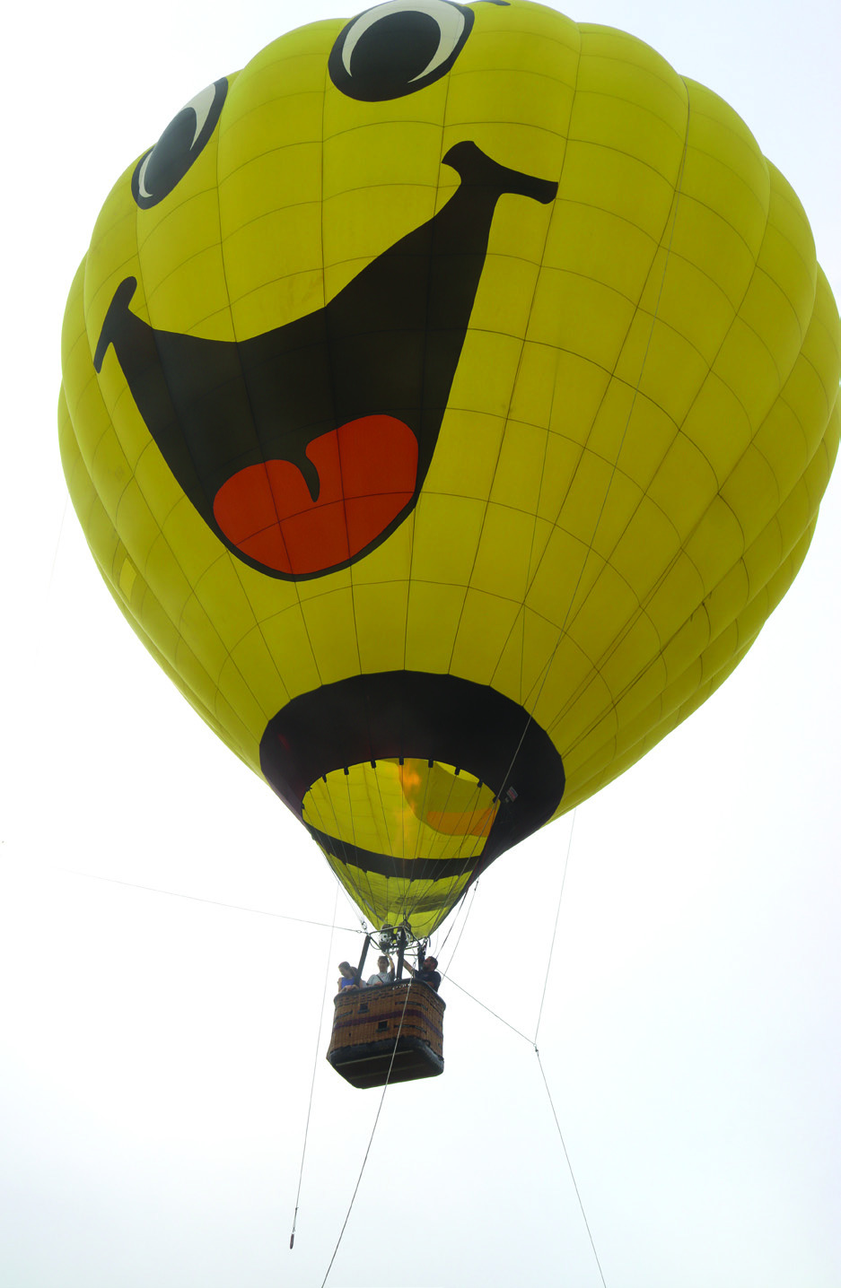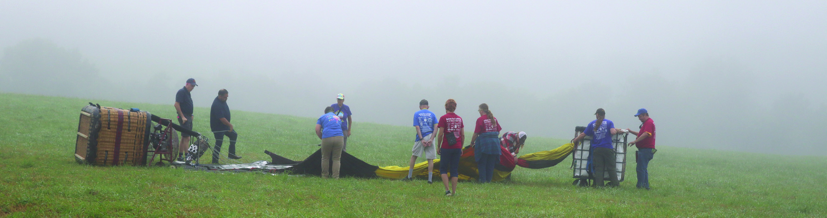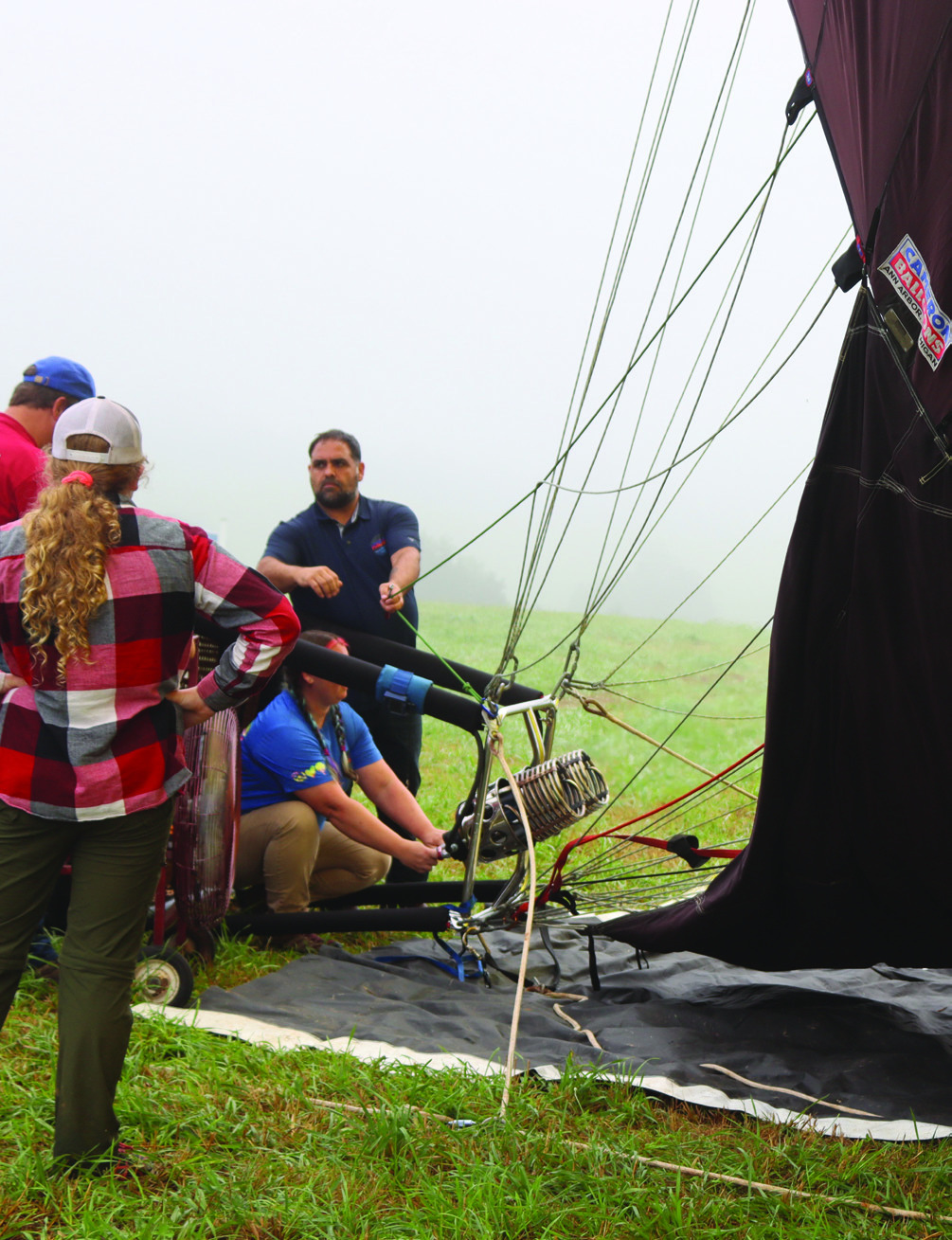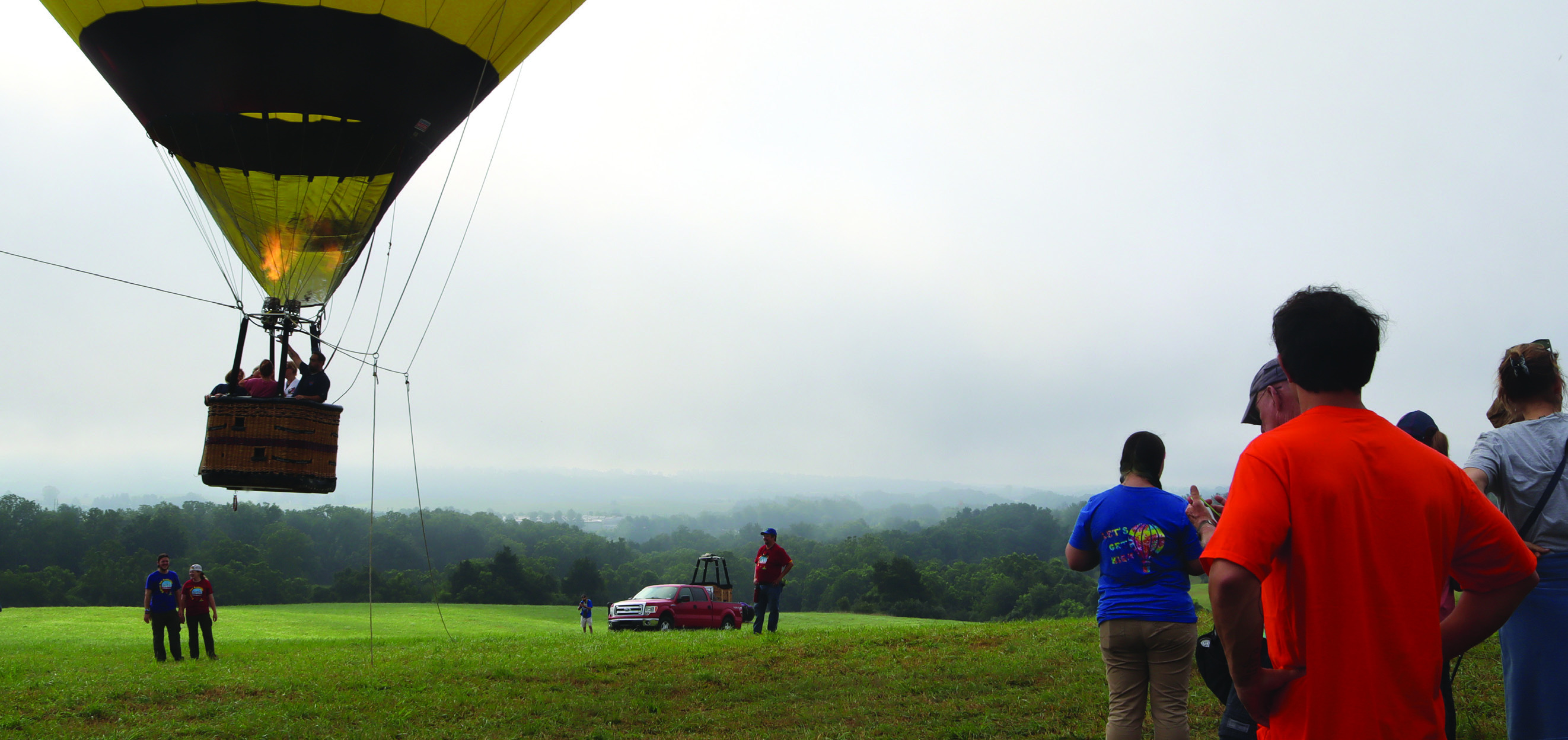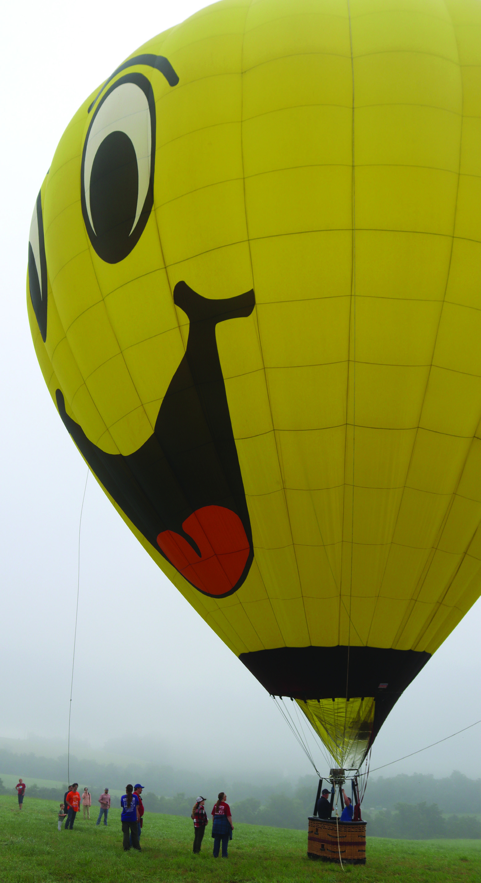 Foggy conditions prevented the hot-air balloon launch Saturday morning during the annual Balloons Over Rockbridge festival, but the “Smile High” balloon owned by Matt Hurst from Tennessee offered tethered rides that morning. (Stephanie Mikels Blevins photos)