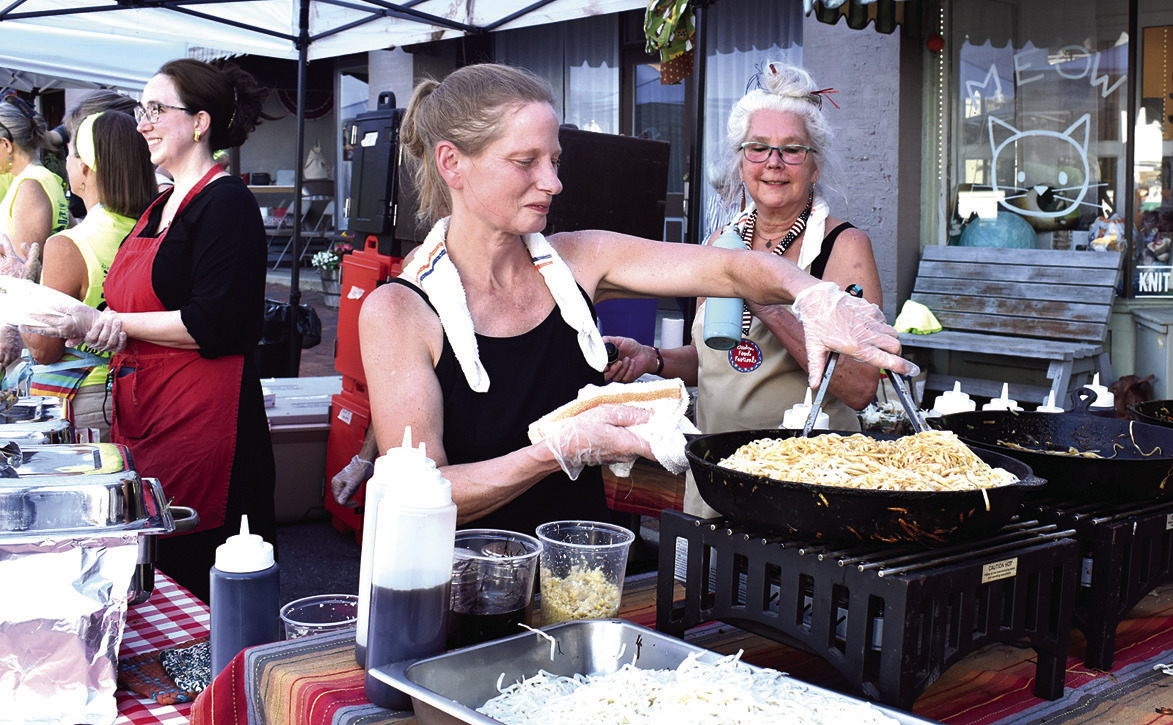 ConnectionsPlus Healthcare + Hospice partnered with the Lexington Catering Co. for this year’s Freedom Food Festival. Jennifer Sobczynski prepares a skillet of Blue Heron Café spicy fried noodles for while celebrity chef Laurie Macrae looks on. (Joann Ware photo)