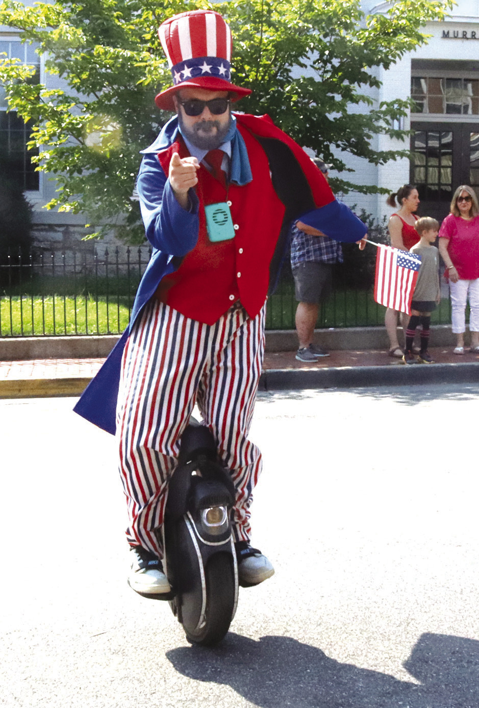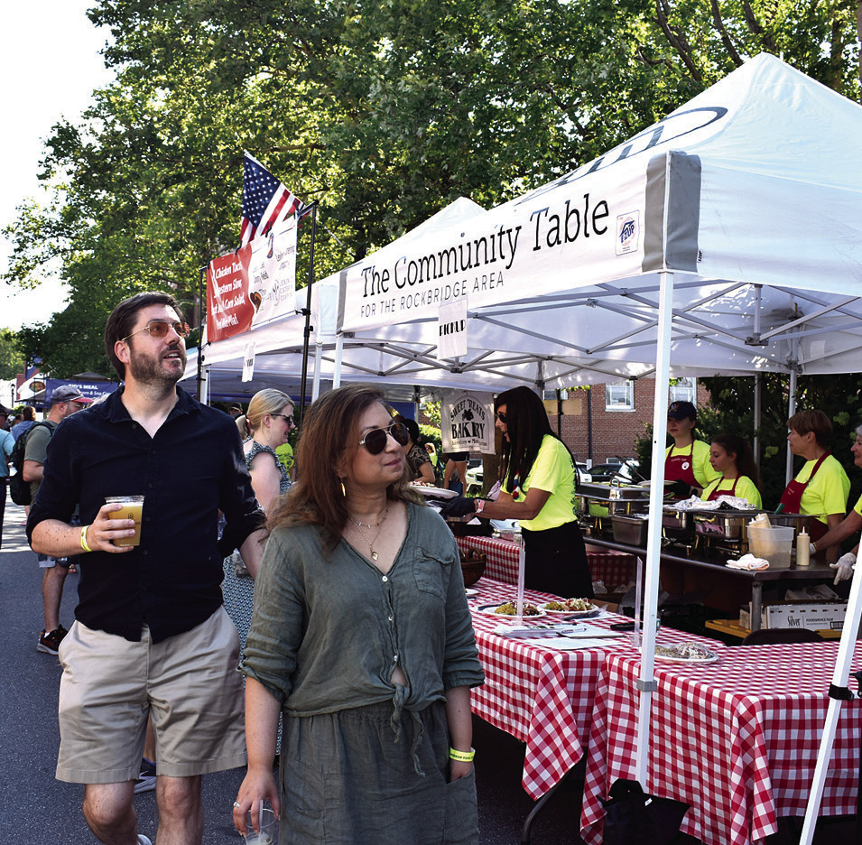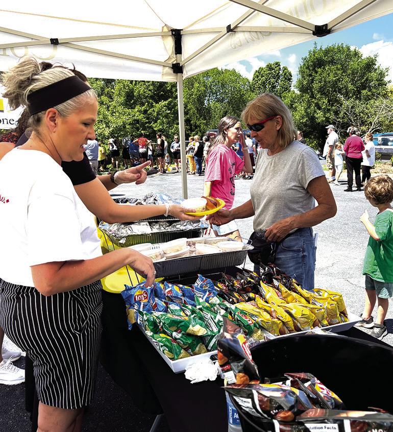 ABOVE, residents pick up food during the picnic presented by CornerStone Bank. AT IMMEDIATE RIGHT, attendees at the Freedom Food Festival check out the dining options. AT FAR RIGHT, Uncle Sam rides in the children’s bike parade. (photos by Mary Woodson, Joann Ware and Stephanie Mikels Blevins)
