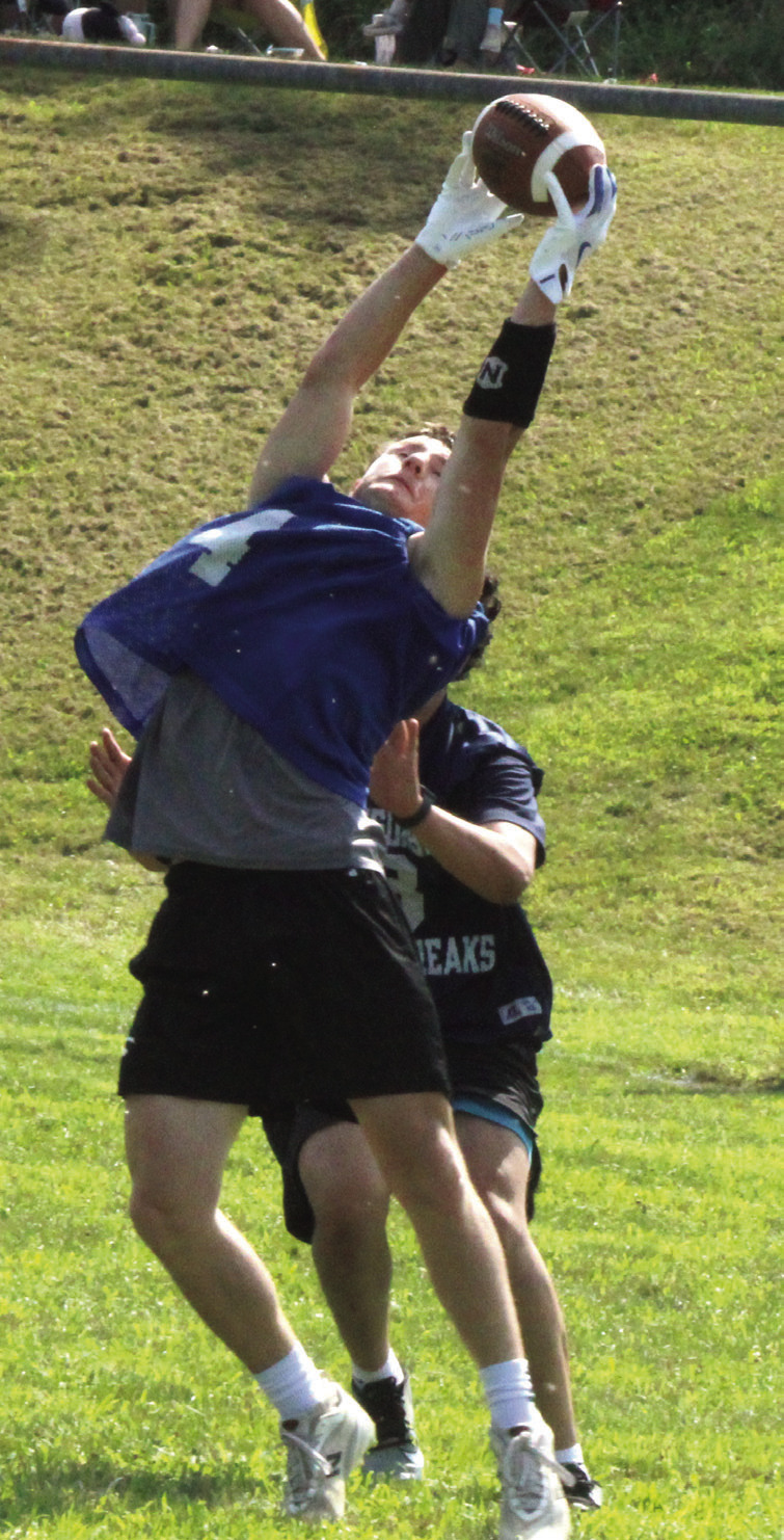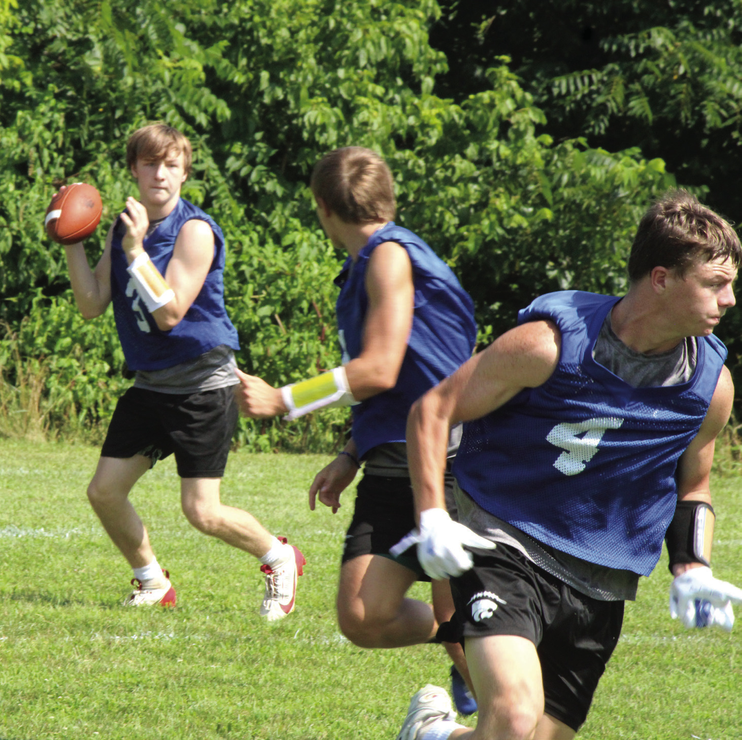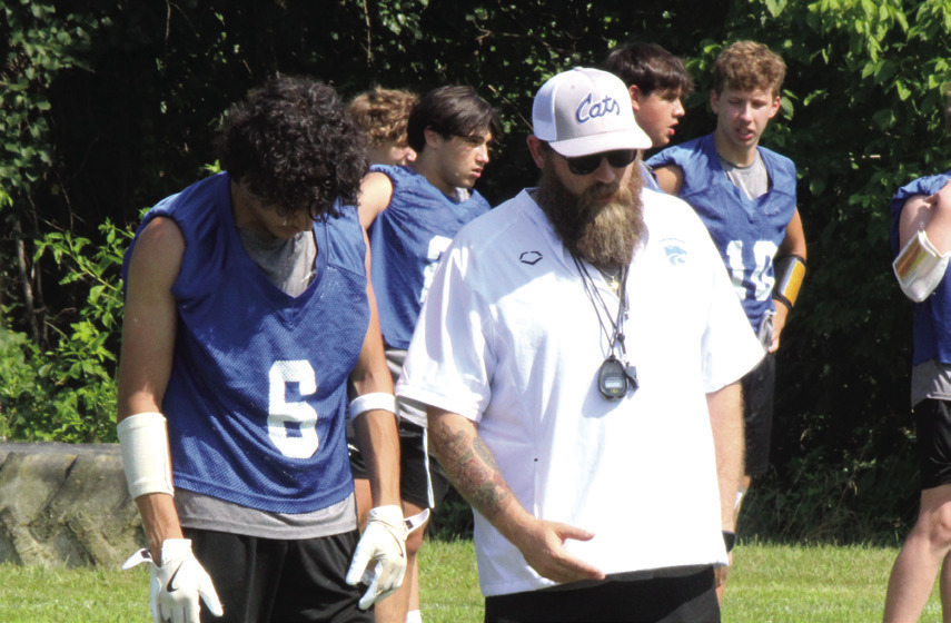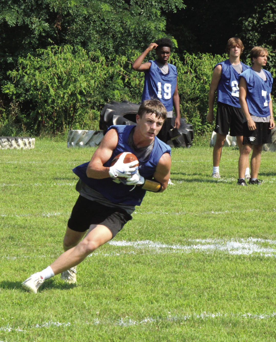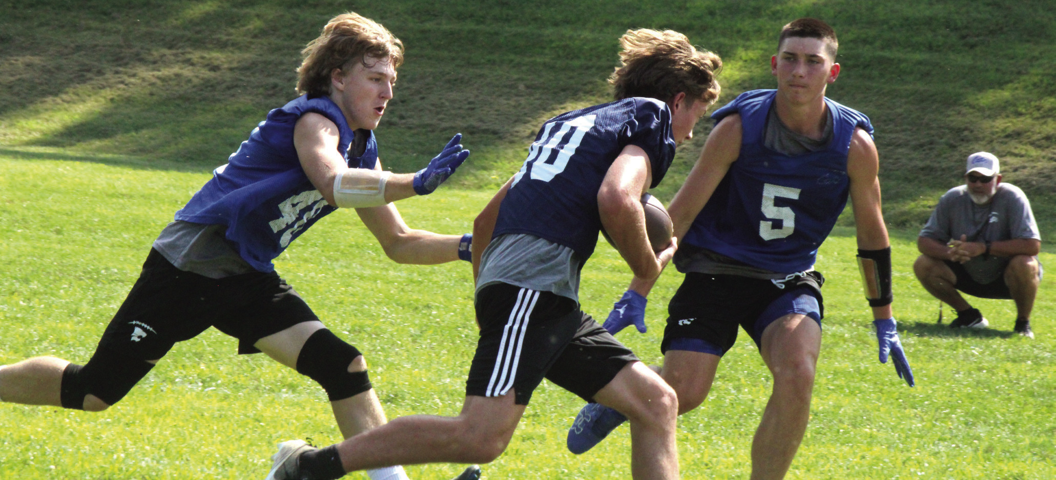 Players from the Rockbridge County High School football team defeated Harrisonburg in 7-on-7 football on Friday afternoon at the Wildcats’ lower practice field in Lexington. The Wildcats scored three times while holding Harrisonburg scoreless. First-year RC head coach Zack Rhodenizer (above, wearing cap and talking to Cole Dorey), was pleased with how his players did. ABOVE LEFT, RC’s Taylen Tyree prepares to throw the ball as teammate Aiden Meyers runs to get open. ABOVE, TOP CENTER, Dorey bats down the ball. AT TOP RIGHT, Meyers catches the ball. BELOW, Wildcats John Clements (left) and Pat Looney (5) surround a Harrisonburg player while RC assistant coach Robert Rhodenizer (far right) watches. AT RIGHT, Meyers runs with the ball. (Stephanie Mikels Blevins photos)