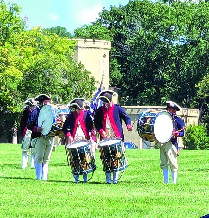 The Plymouth Fife and Drum Corps, an all-youth band from Plymouth, Mich., per-formed 18th and 19th century fife and drum music, while demonstrating marching and color guard maneuvers on the parade ground at Virginia Military Institute on Saturday morning July 12. Members of the corps wear 1783 period replica uniforms of George Washington’s Life Guards, and each woolen uniform weighs 10 pounds. VMI alumnus Dr. Rodney Daniels’99 is the current vice president and equipment manager for the corps. He has been involved for seven years and has three children who are members. (Joann Ware photos)