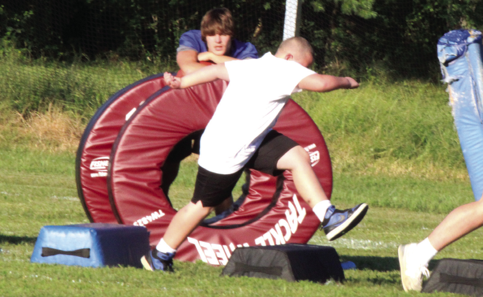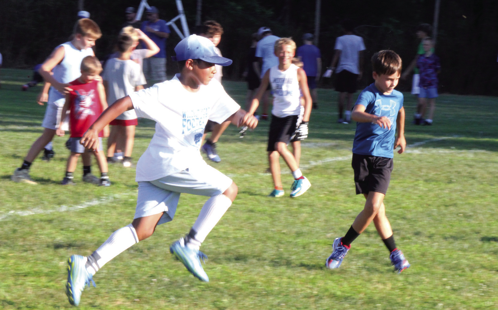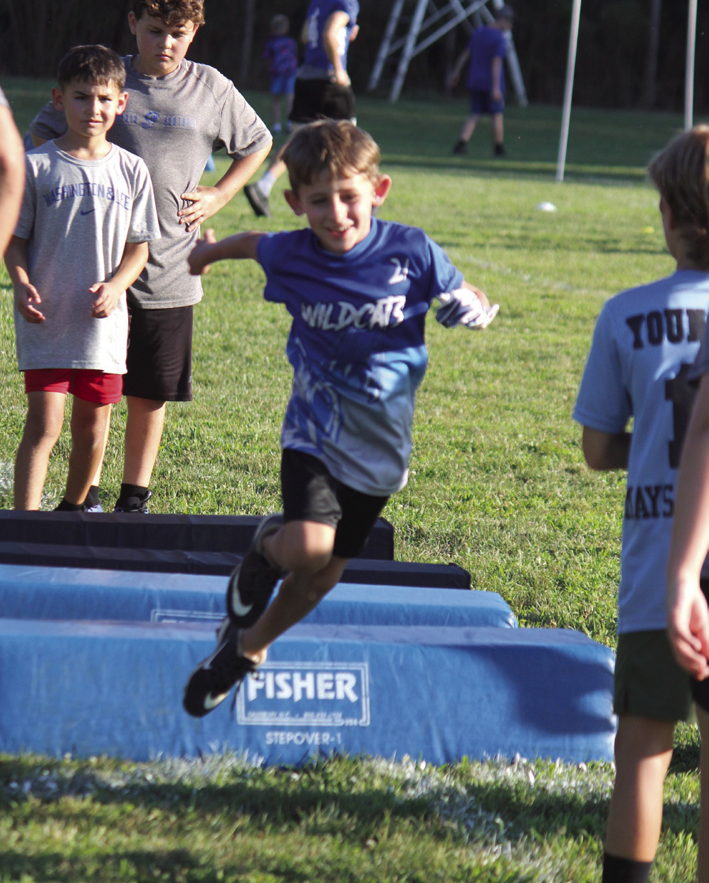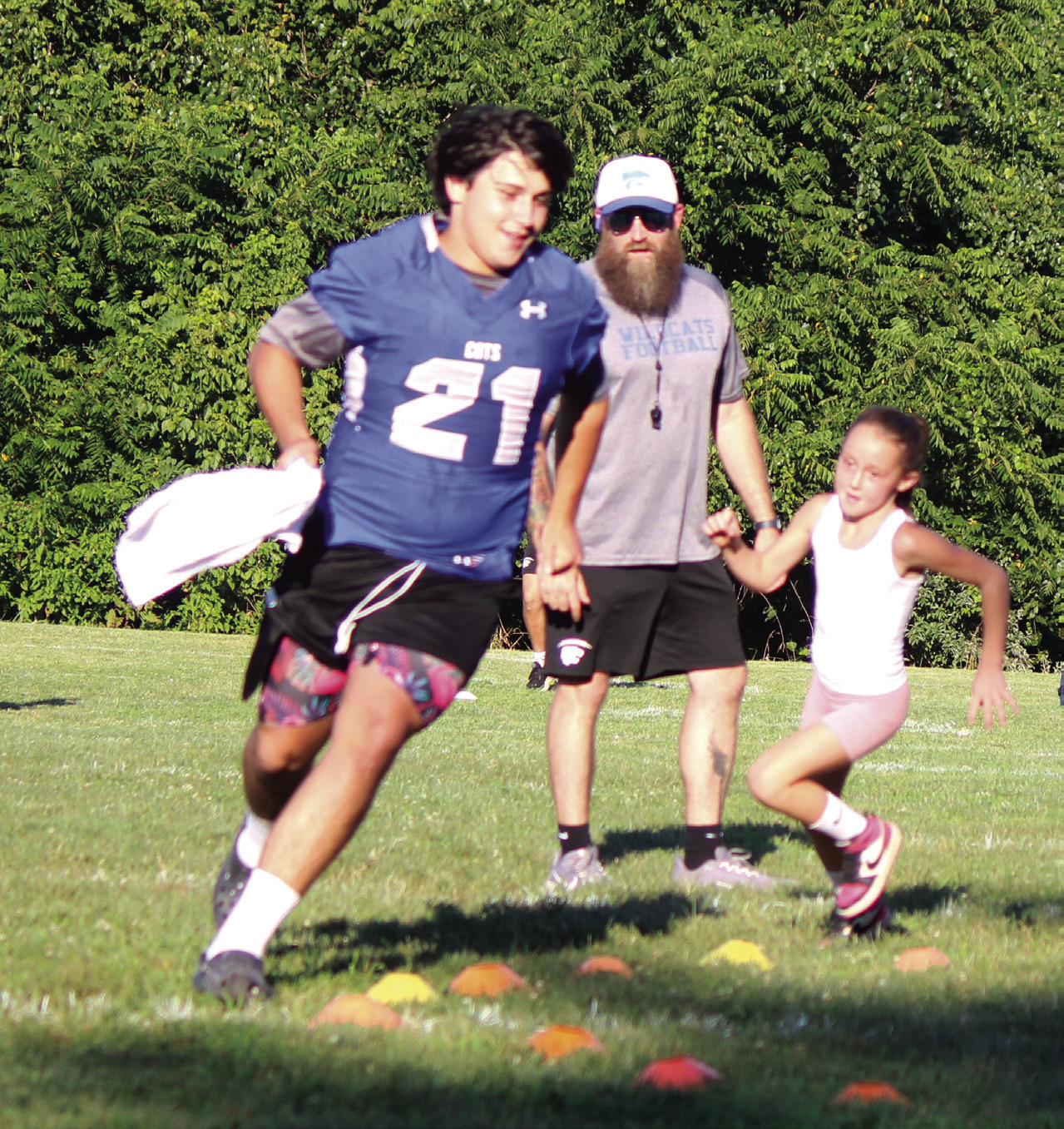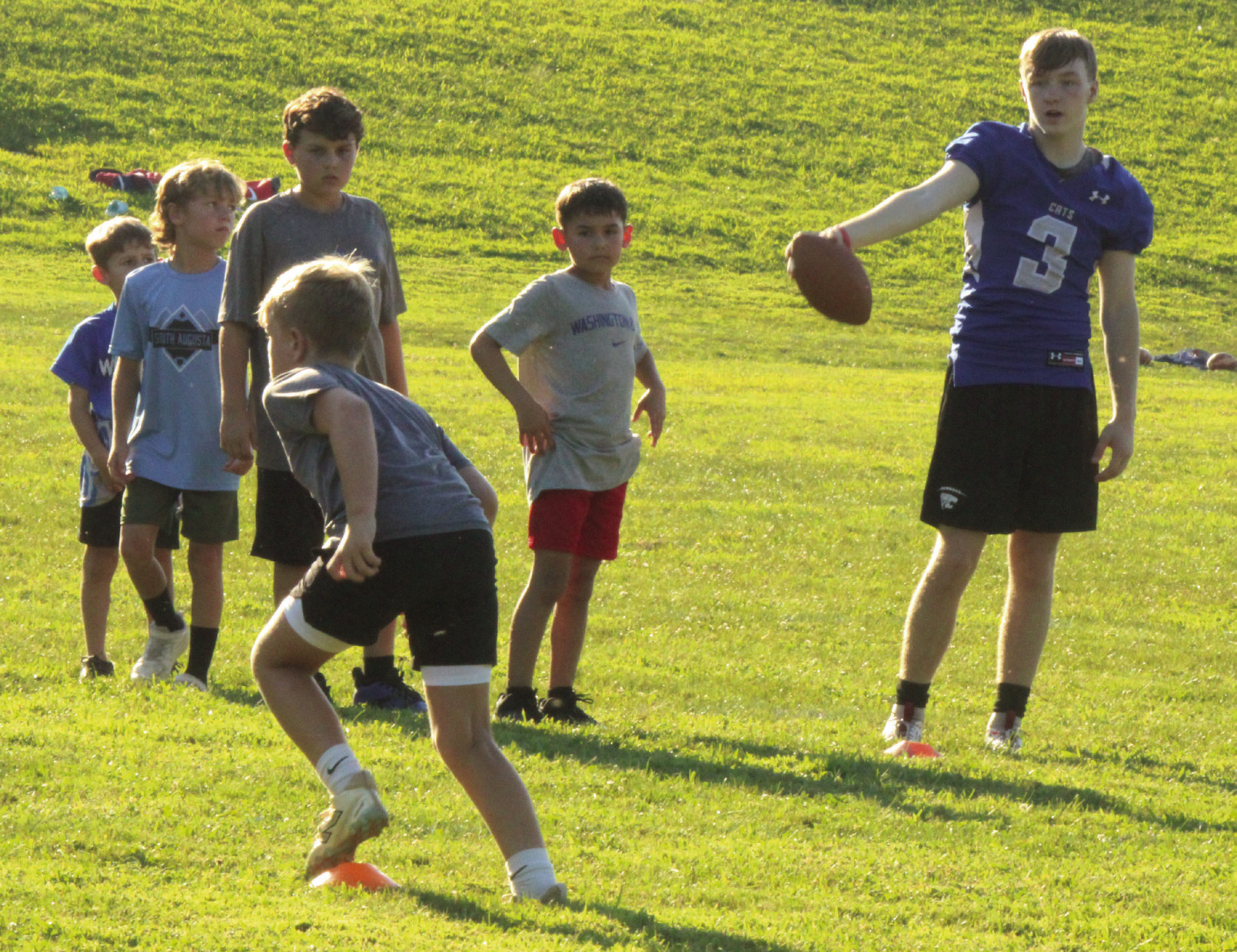 The Rockbridge County High School football team held a youth football camp for children from kindergarten through seventh grade on Monday and Tuesday of last week at the high school, with 27 youths participating. The instructors at the camp were RC football coaches and several players, teaching fundamentals and running drills. ABOVE, RC’S Marshall Clements (21) leads a camper around cones while RC head football coach Zack Rhodenizer watches. AT FAR RIGHT, Wildcat Taylan Tyree (3) holds the football while watching a camper run. (Stephanie Mikels Blevins photos)