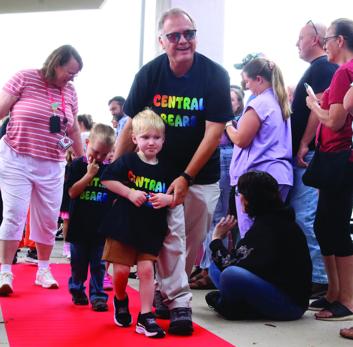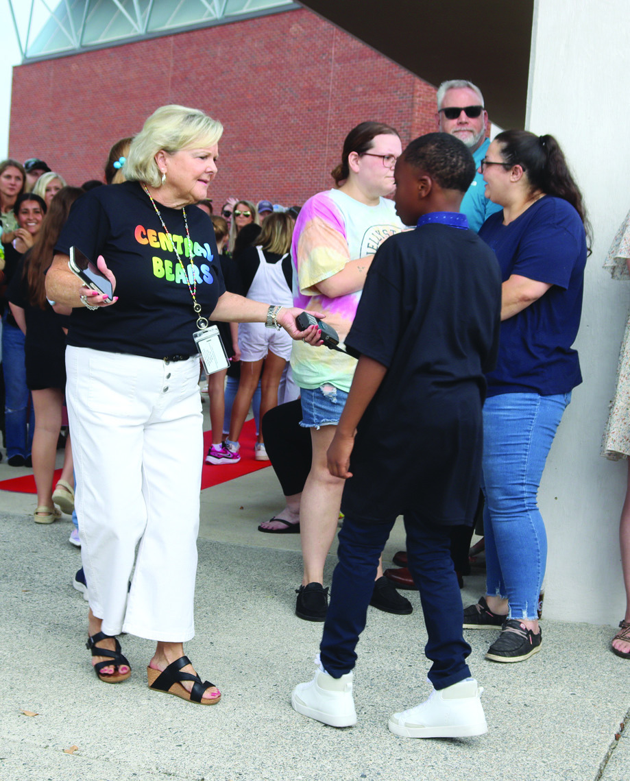 In what has become a tradition at Central Elementary School, students entered the school year Tuesday on a red carpet, walking into school to the song “We Are Family” amid an adoring crowd of family members. The principal, Robin Parker, (at bottom right) even tried getting some of the students to dance to the music with her. (Stephanie Mikels Blevins photos)