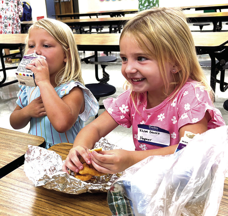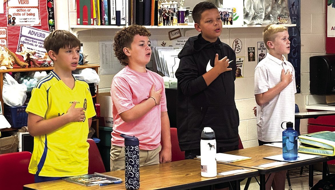 Fairfield Elementary School students quickly got down to business Tuesday morning, some after enjoying breakfast in the cafeteria (at right). Music teacher Stephanie Clark got students to try their hands at the Xylophone (above), while in Cathy Whitesell’s fifth grade class, the day started with the Pledge of Allegiance (below). (Mary Woodson photos)